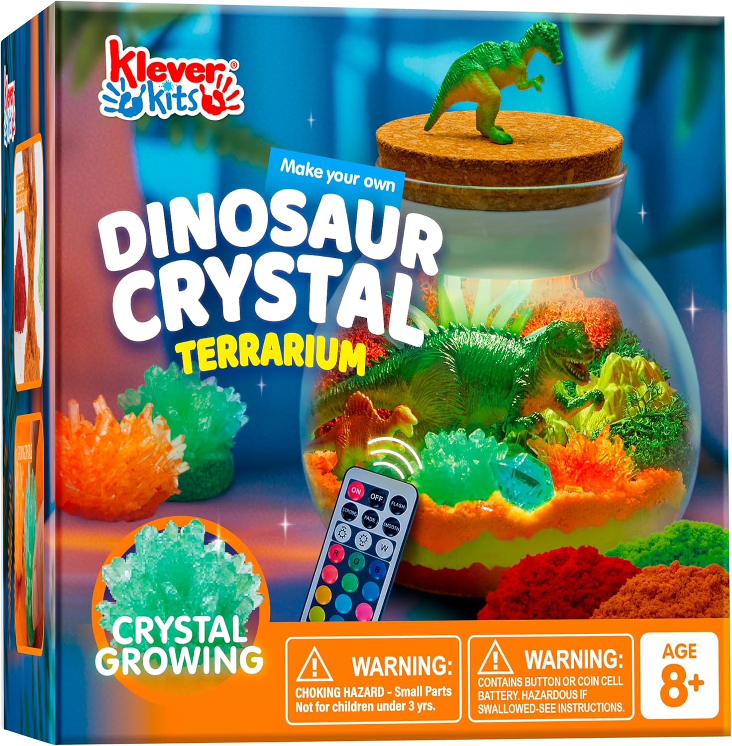 Klever Kits Make Your Own Dinosaur Crystal Terrarium Crafts Kit for Kids-Crystal Growing Science 12 Color LED Night Light Birthday Gifts Toys for Kids