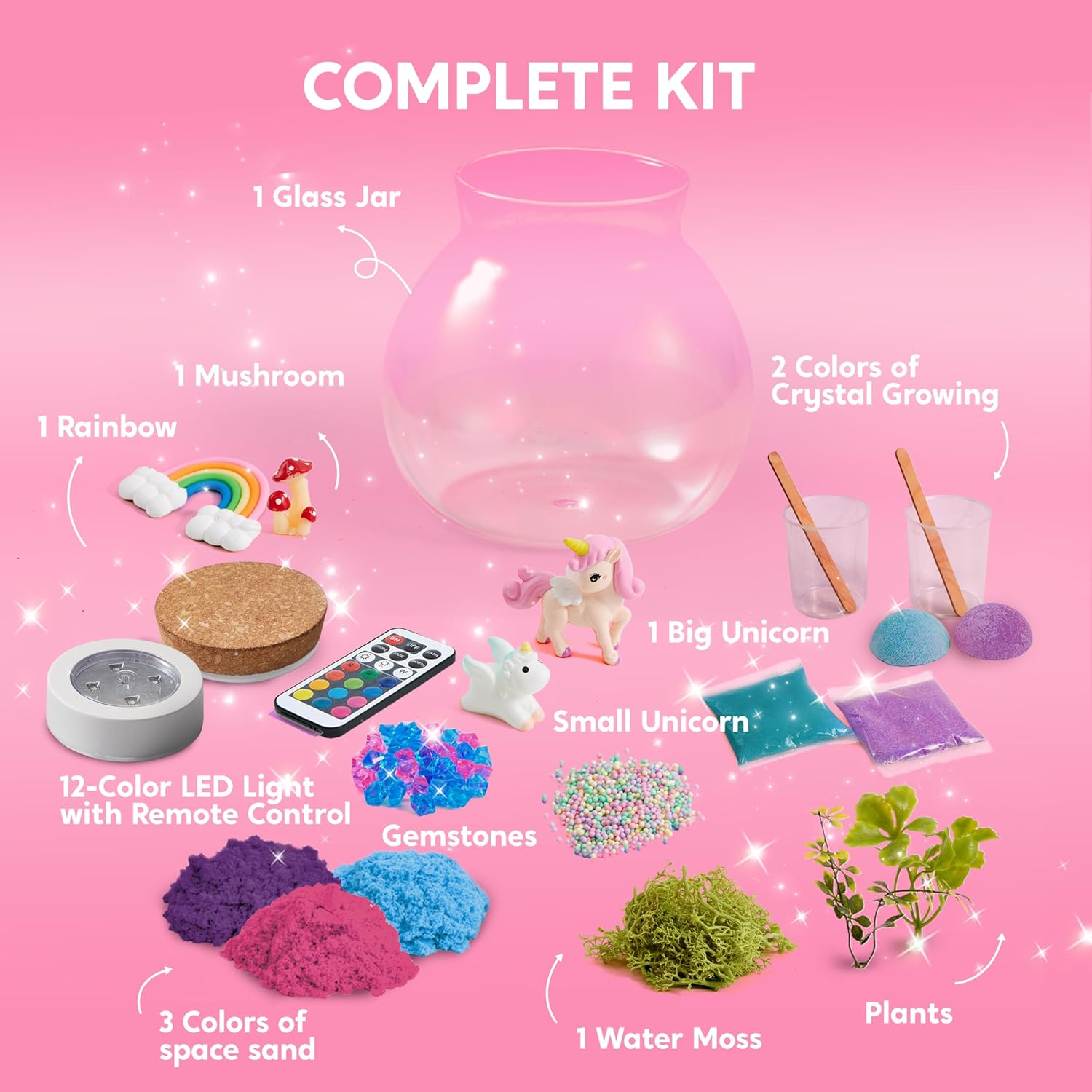 - COMPLETE UNICORN TERRARIUM KIT: This all-in-one kit includes 3 colors of sand, a terrarium jar with a lid featuring a 12-color LED light, a light remote control, 1 large unicorn, 1 small unicorn, gemstones, 1 rainbow, 1 mushroom, 2 plant pieces, 1 moss, 1 bag of foam balls, and 2 sets of crystal-growing materials. A magical activity to spark creativity and imagination!