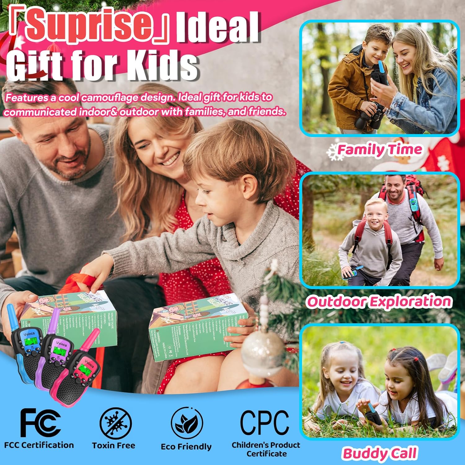- Perfect Gifts Toys for Kids: Vvinca 3 packs walkie talkies for kids rechargeable are designed with a unique look. The Colorful kids walkie talkies are great choices as toys for boys and girls ages 3-12, it is as ideal birthday gifts, Christmas gifts, or other holiday gifts for children. Allows them to enjoy the fun of communicating, and playing with their families and good friends, suitable for indoors, hiking, camping, and other outdoor exploration. (No standalone lithium batteries are sold with the product.)