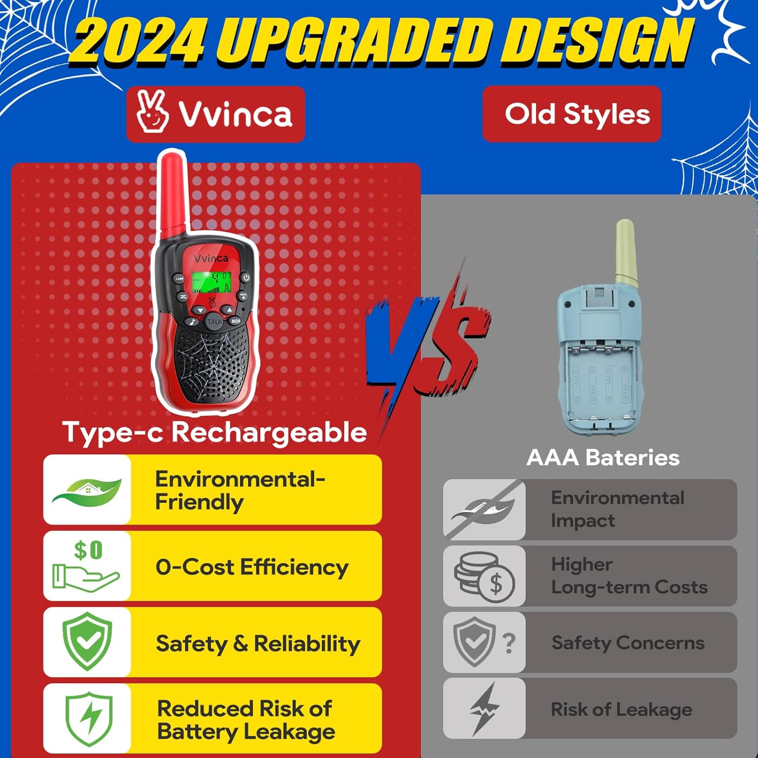 - Ideal Gifts Toys for Kids : The kids walkie talkies feature spider design, making them great toys for boys and girls ages 3-12. Our 2 packs walkie talkies for kids rechargeable is a huge hit for birthday gifts, Christmas gifts, or other holidays gifts. These walkie talkies spark kids' imaginations and keep them entertained for hours! Let them enjoy the day's fun of communicating and playing with family and friends, indoors or outdoors, like hiking, camping, and exploring. (No standalone lithium batteries are sold with the product.)