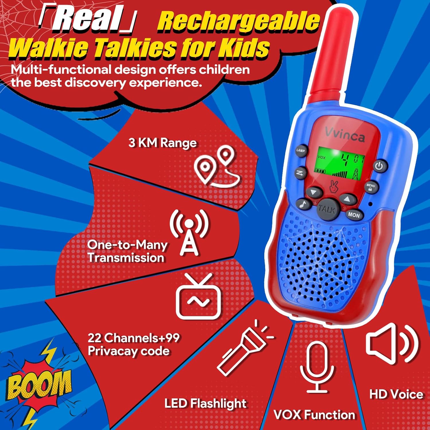 Vvinca Walkie Talkies for Kids Rechargeable, Spider Toys for Ages 3 4 5 6 7 8 9 10 Boys Girls Christmas Birthday Gifts for 3-12 Year Old, 2 Way Radio 22 CH VOX Long Range Walkie Talkie with Flashlight