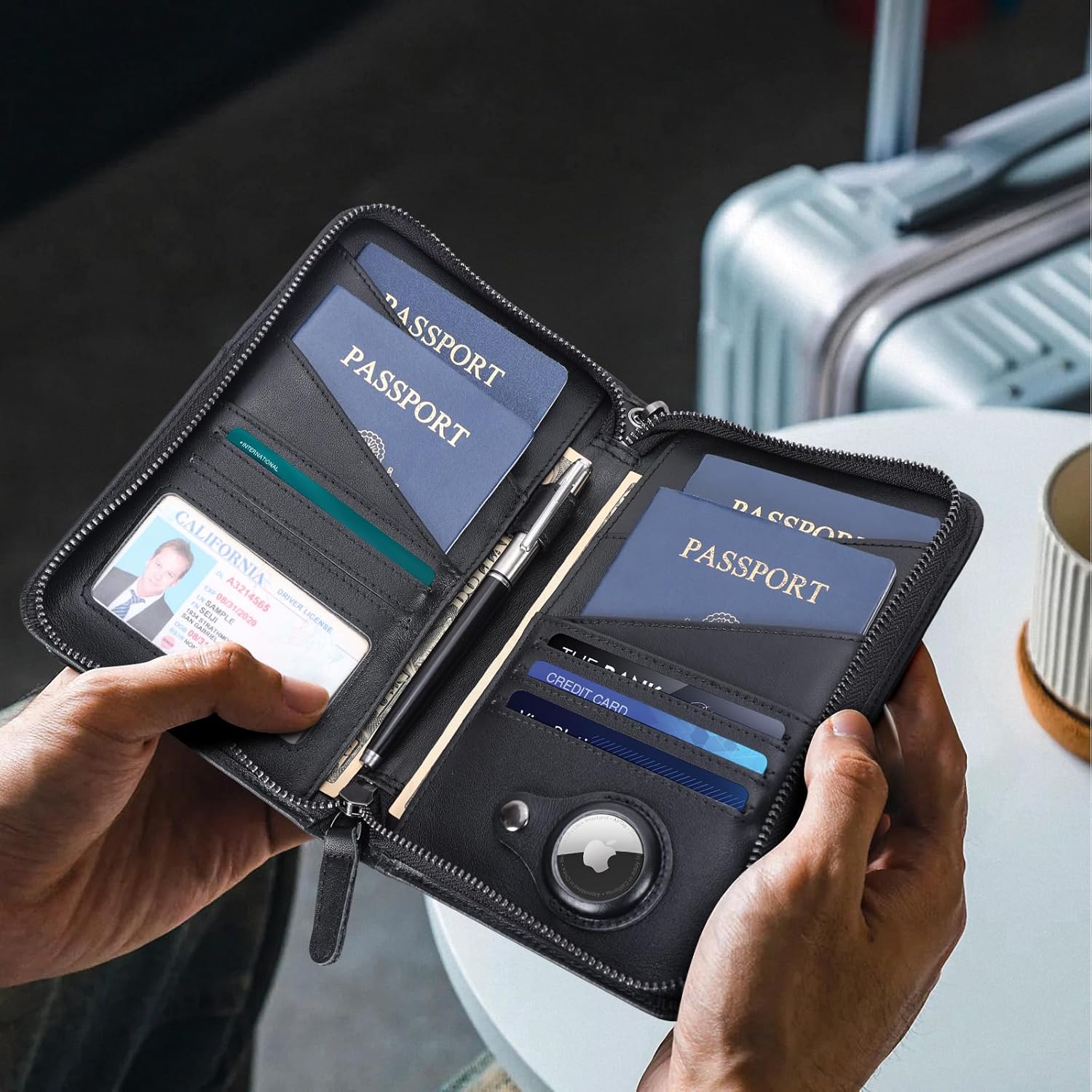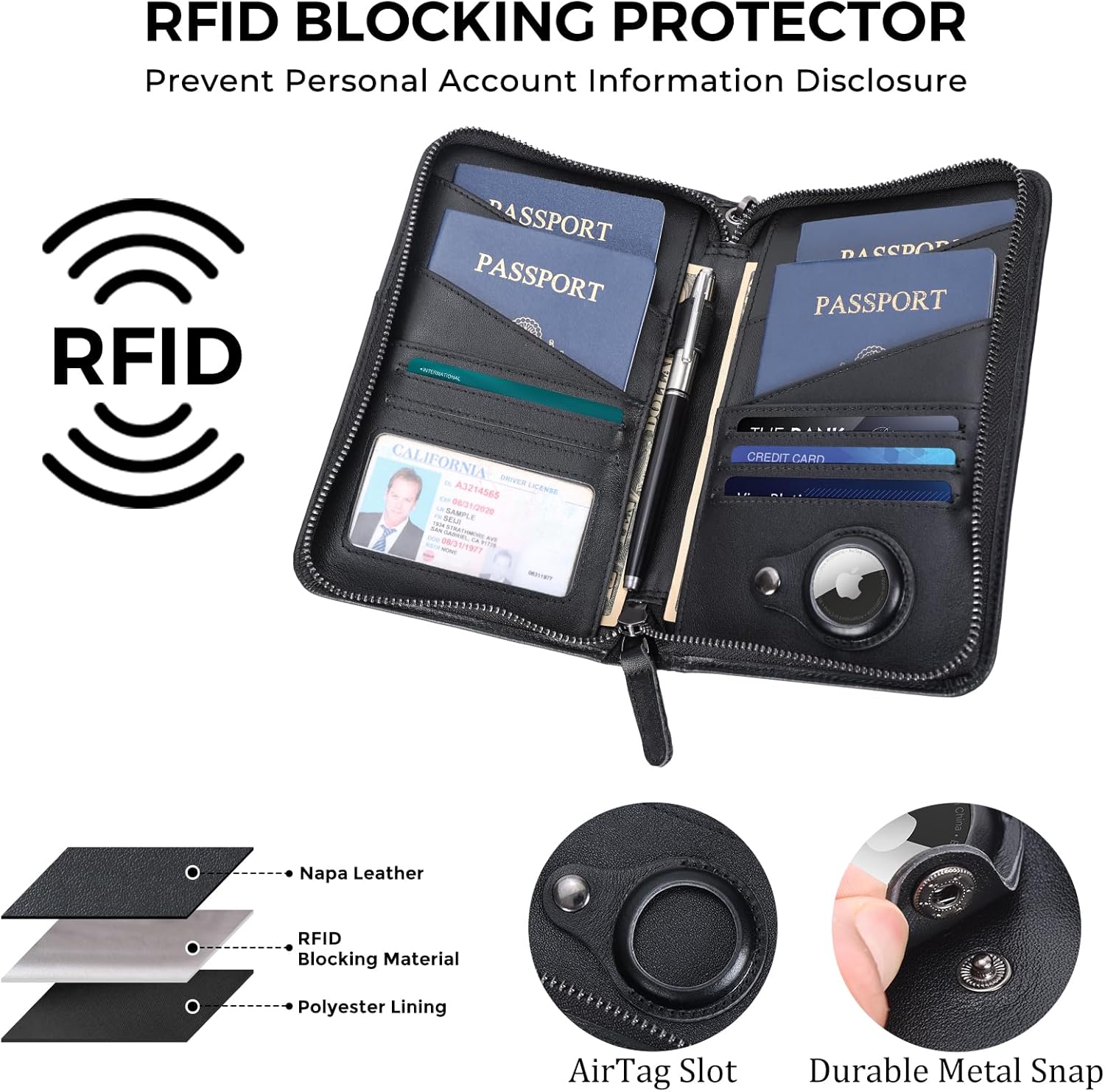 - Large Capacity - 6 passport pockets, 4 card pockets, 1 ID card window, 2 large pockets for cash, 1 pen holder, 1 AirTag slot, 1 front pocket and 1 removable strap.