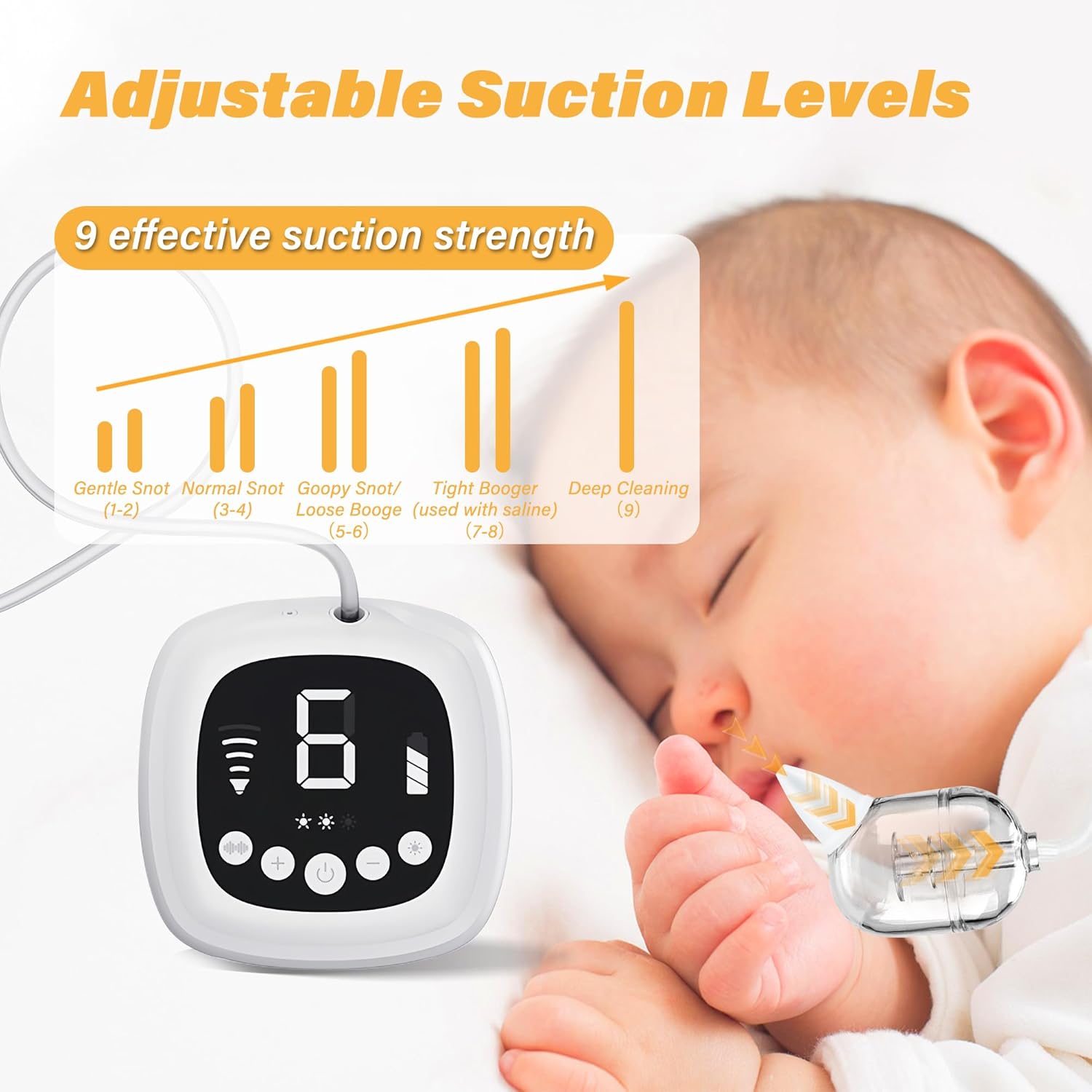 - [Adjustable Suction Power]: TopQuaFocus Nasal Aspirator equipped with 9 levels of suction power up to 65kPa, ensures efficient nasal cleansing for babies and toddlers.
