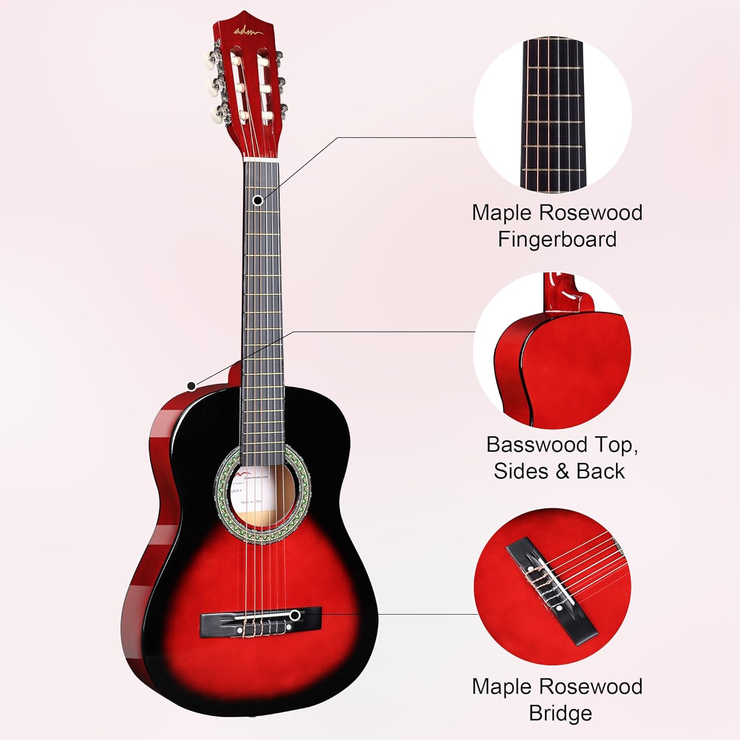 ADM Beginner Acoustic Classical Guitar Nylon Strings Wooden Guitar Bundle Kit for Kid Boy Girl Student Youth Guitarra Online Lessons with Gig Bag, Strap, Tuner, Strings, Picks (34 Inch, Redburst)