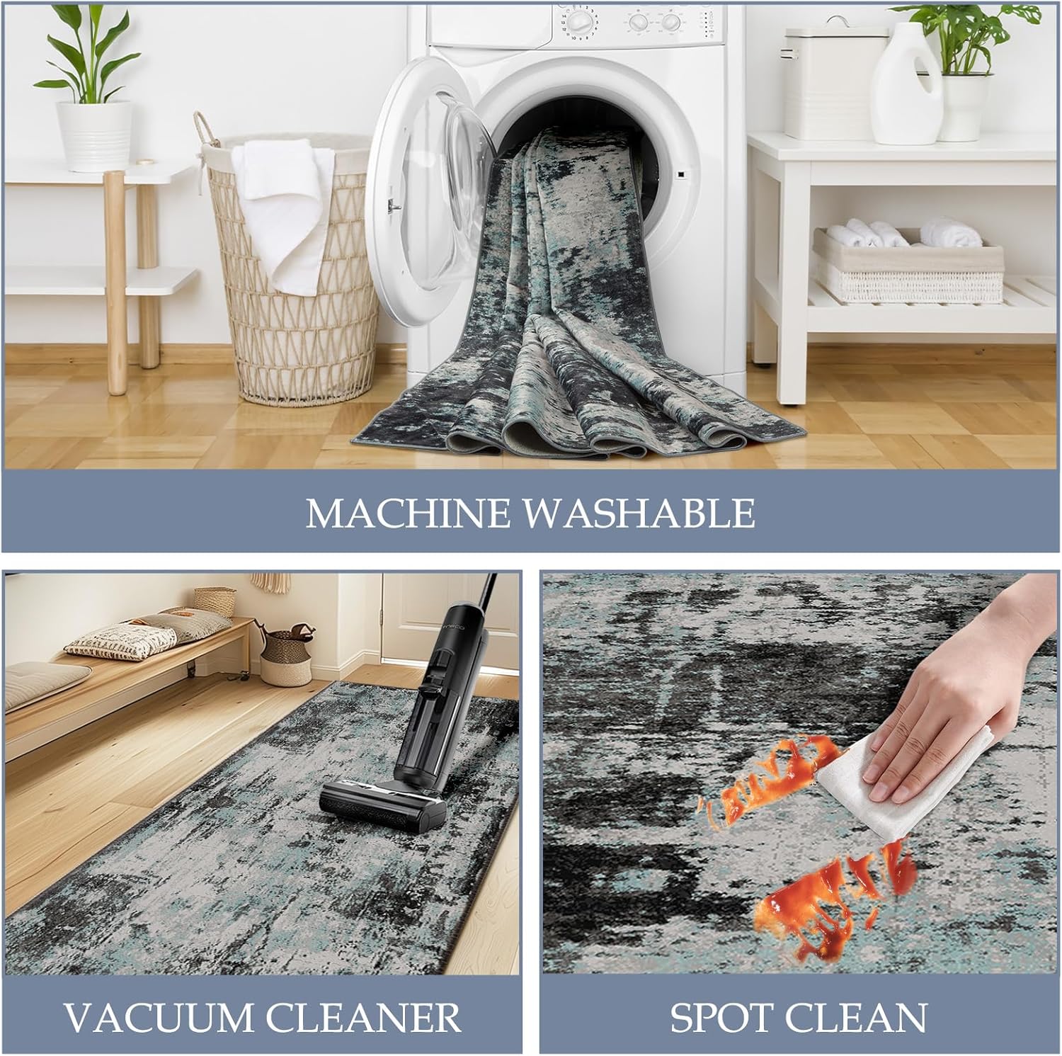 - Tides Series β Effortless style that flows with your life.This modern machine-washable non-slip rug features reinforced edges and a low-pile design that resists dirt. Its water-repellent surface makes spills easy to clean - liquids bead up for quick wiping. Simply machine wash in cold water (no bleach) to refresh. The non-slip backing keeps it securely in place. A perfect blend of function and contemporary design for active homes.