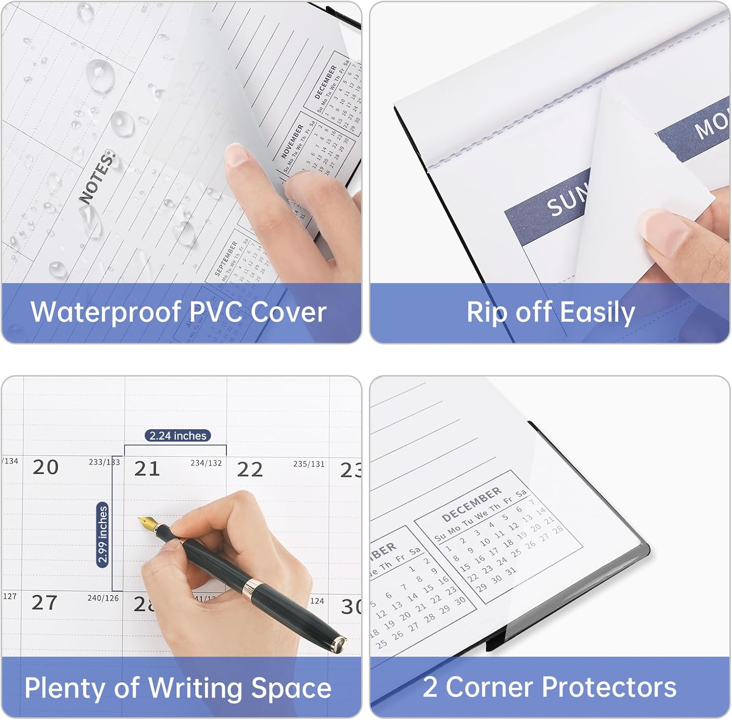 - Calendar Features: Thick paper resists ink seepage, ensuring clean and crisp writing. It comes with a transparent PVC cover to protect against dust and liquids, along with two corner protectors to keep the pages flat. The cutting line allows for effortless tearing of each month's page, making it perfect for long-term use as a wall calendar.