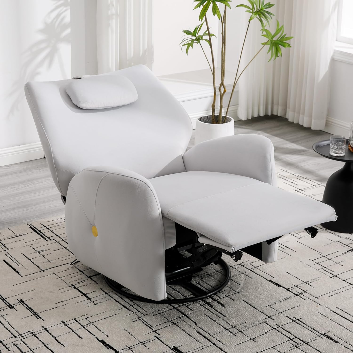 - 270Β° Swivel Glider Recliner Chair: The power recliner chair can swivel 270 degree smoothly and quietly to meet your various needs, which gives your more convenience and comfort when you recline in it. Adjustable headrest also can be used as a lumbar cushion, which provides comfortable support for your head, neck, back, and waist.