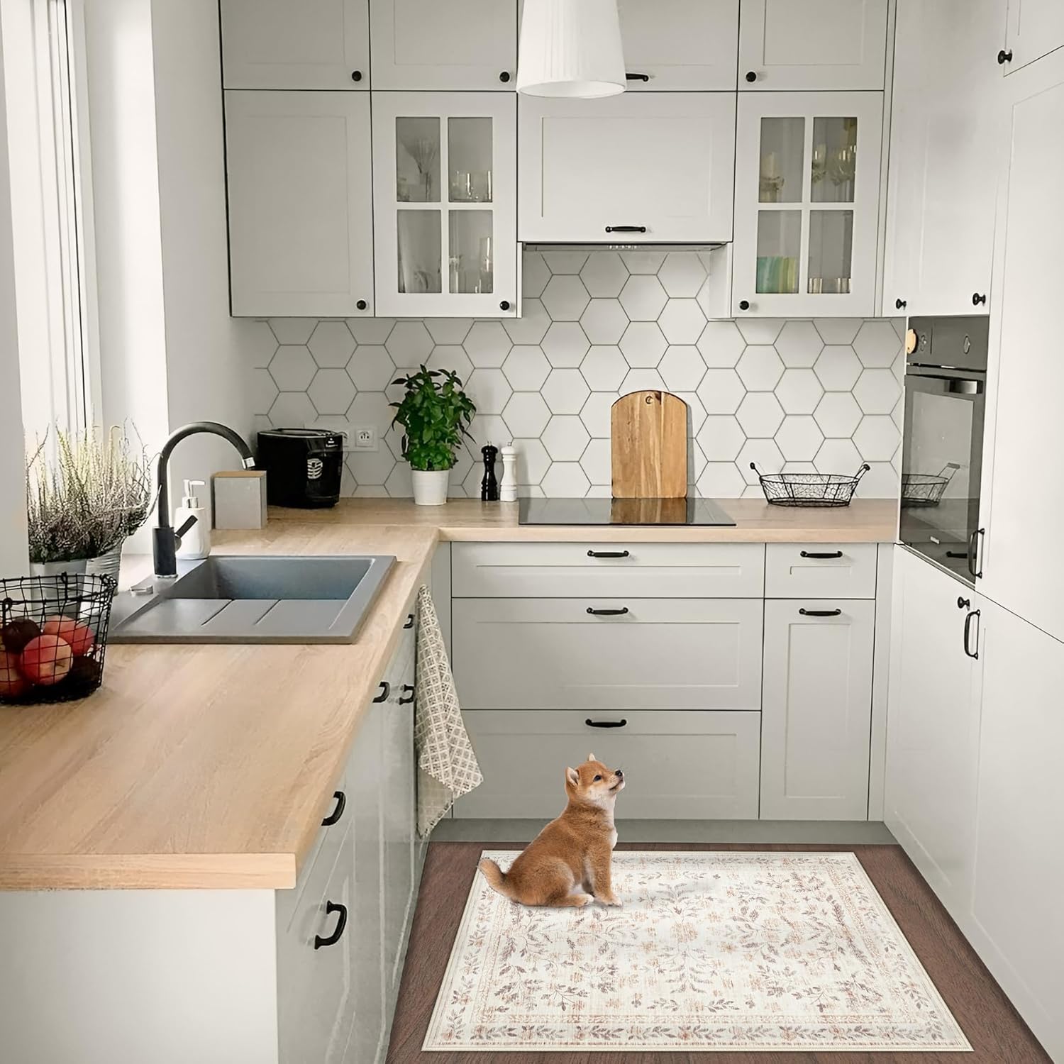 Door Mat Indoor Entrance Rug 2x3, Washable Soft Floral Boho Area Rug Non-Slip Low Pile Small Throw Rugs for Entryway, Kitchen, Entry, Kids Room(2'x3', Floral Beige)