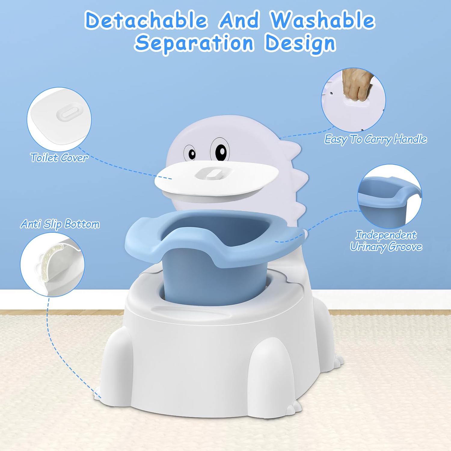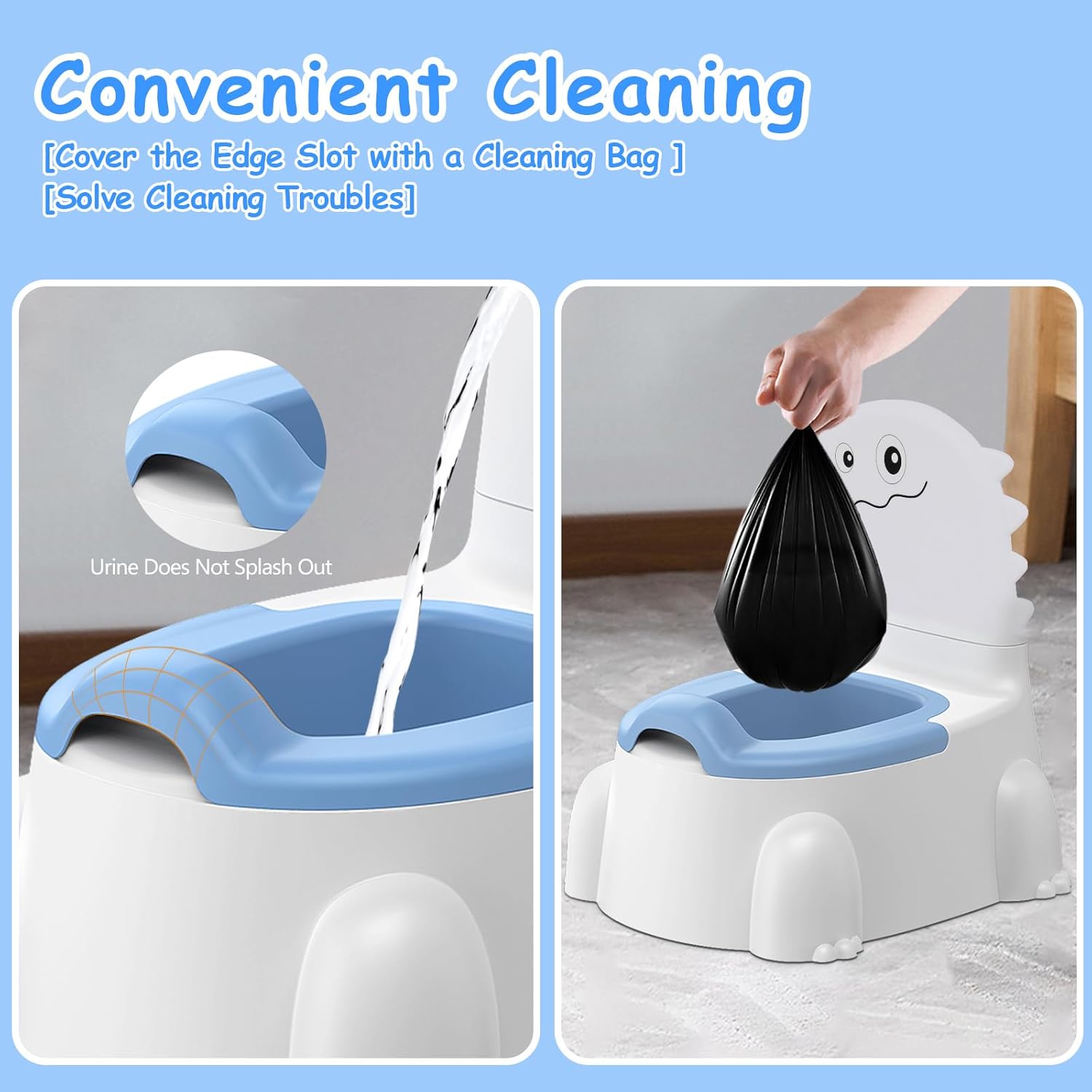 - DINOSAUR THEME - This dinosaur design potty makes training fun for your toddler. A larger, deeper, wider potty helps keep the baby's hip from smelly poo and splashing pee. The smooth inner wall is easy to clean. The kids’ toilet attracts babies to develop a good habit of going to the toilet.