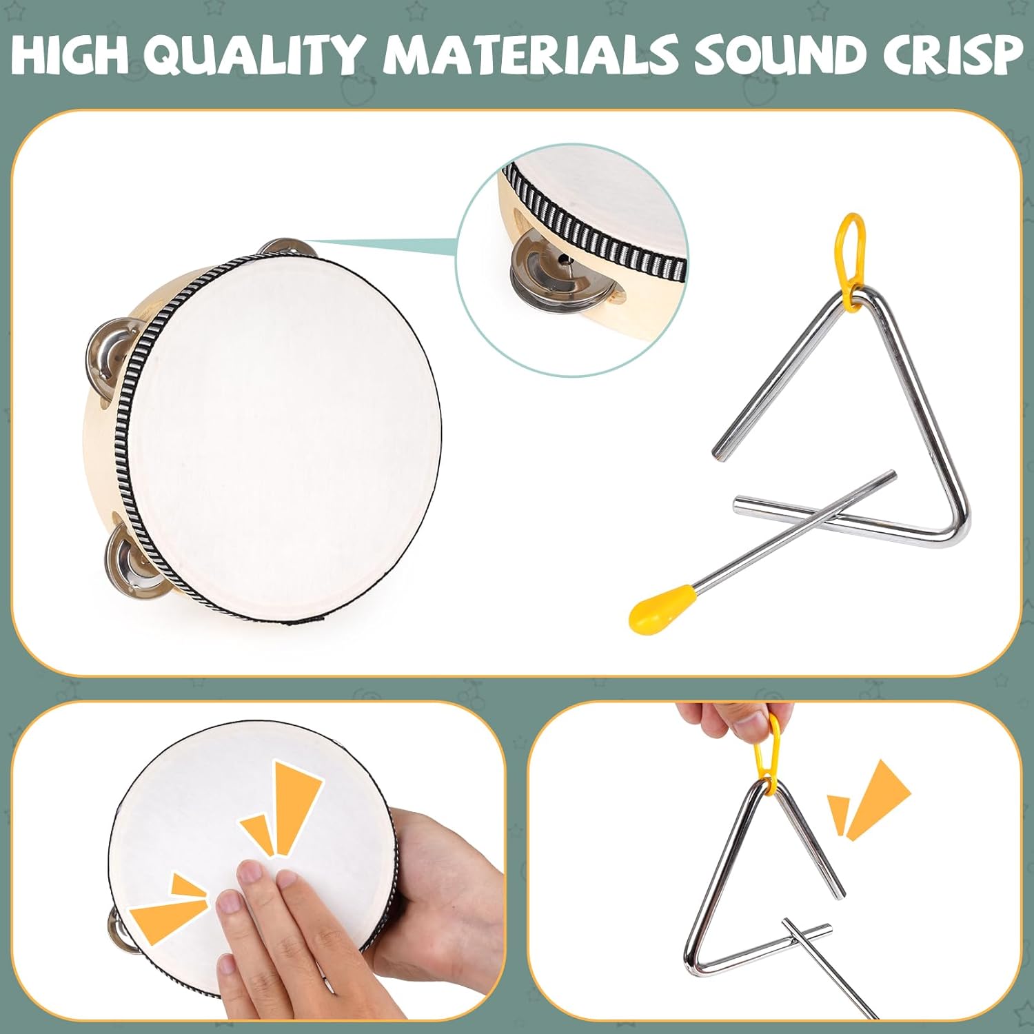 - Complete Wooden Musical Instruments Set for Kids: This natural kids’ percussion set includes 1 Tambourine,1 Xylophone,1 wood sounder,1 rainmaker,1 Maracas,1 Triangle withe striker ,1 castanet,1 clarinet,2 wooden claves. Introduce your toddler to diverse rhythms, tones, and sounds, sparking their musical creativity and sensory development. Perfect as baby musical instruments for toddlers aged 1-3.