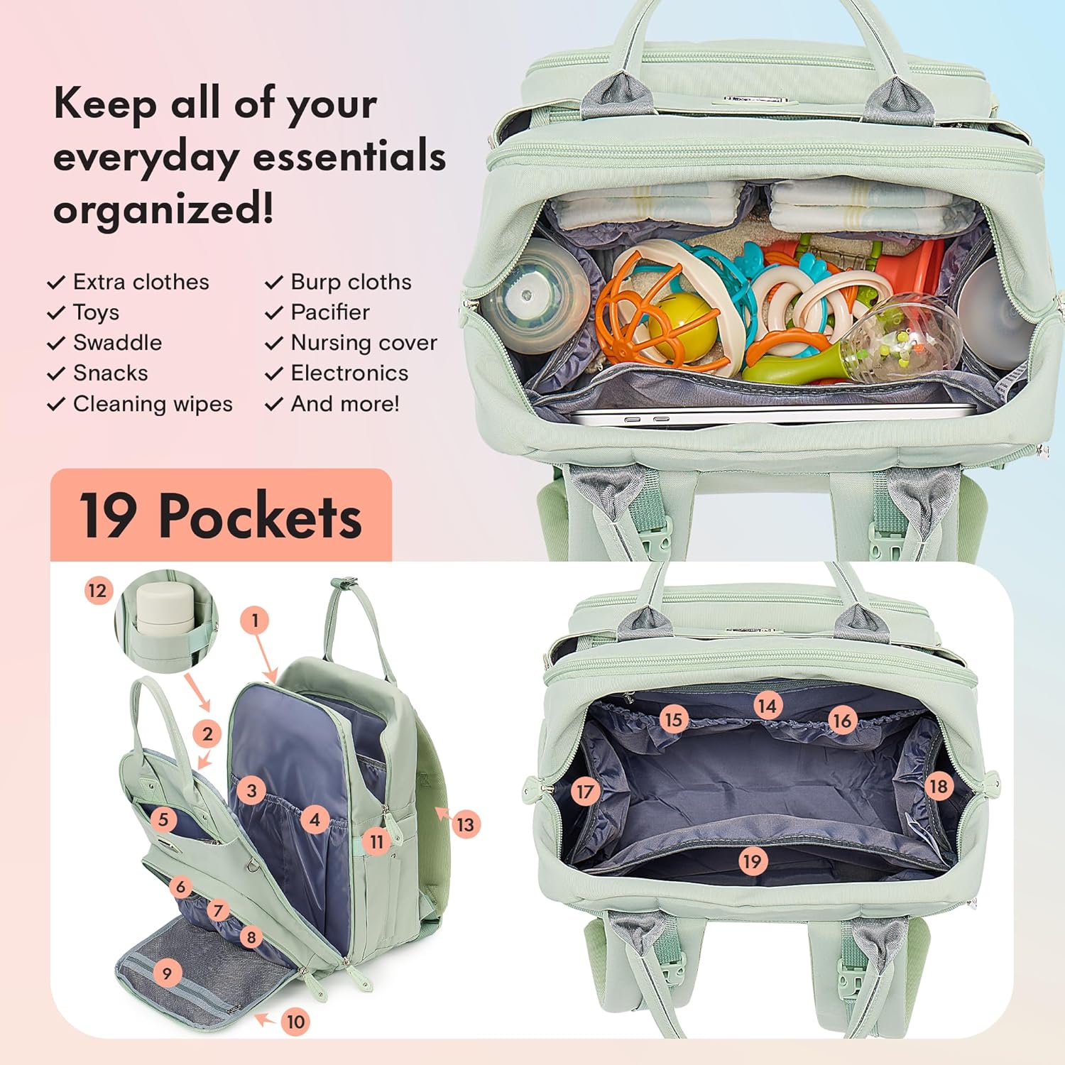 Dikaslon Diaper Bag Backpack with Portable Changing Pad, Pacifier Case and Stroller Straps, Large Unisex Baby Bags for Boys Girls, Multipurpose Travel Back Pack for Moms Dads, Mint Green