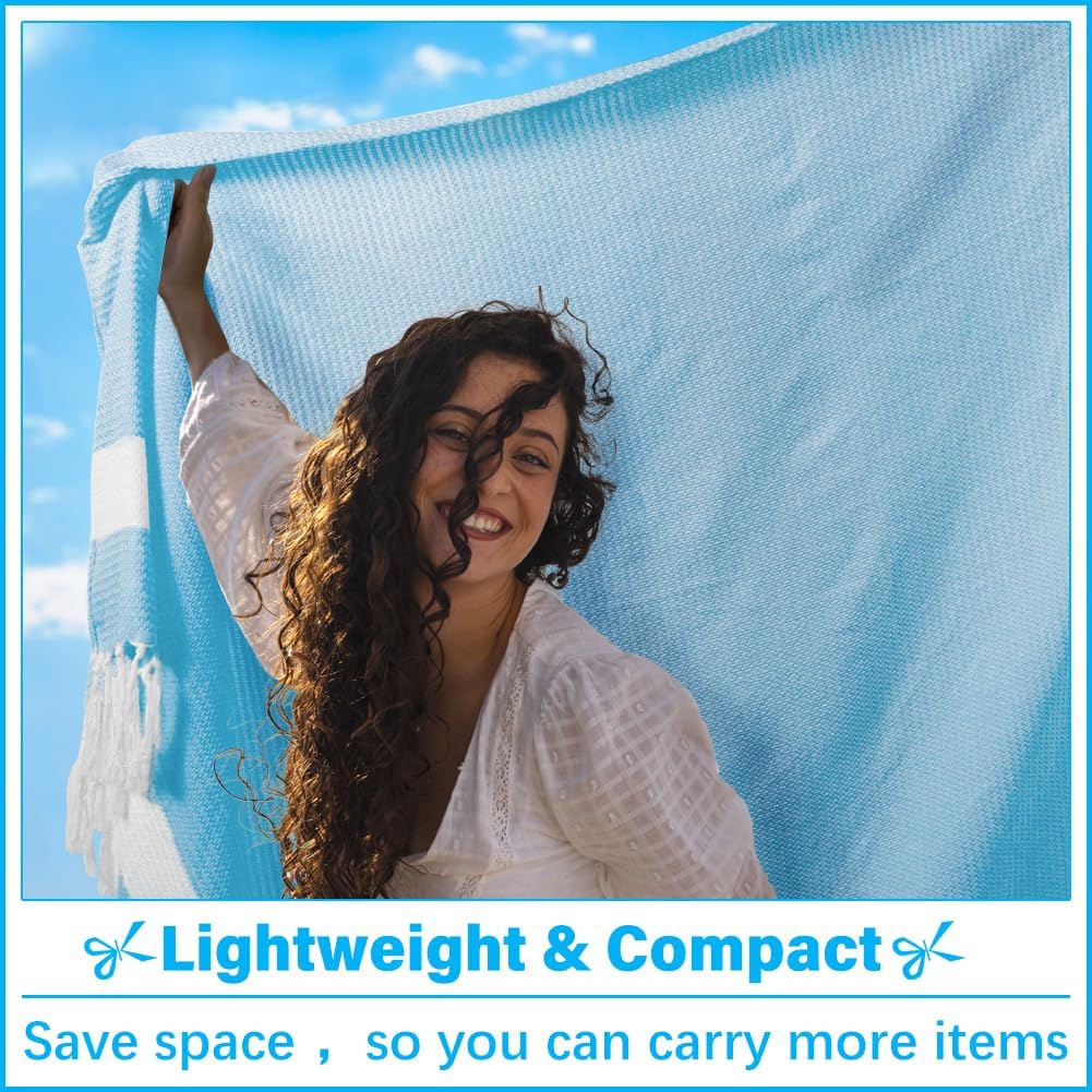 - LIGHTWEIGHT AND PORTABLE:Despite its large size,this turkish beach towel blanket is lightweight and thin,making it easy to fold and carry.Made from soft yet comfortable materials,it wonβt weigh down your beach bag.Its compact design fits neatly into luggage or a backpack,perfect for travel and outdoor adventures