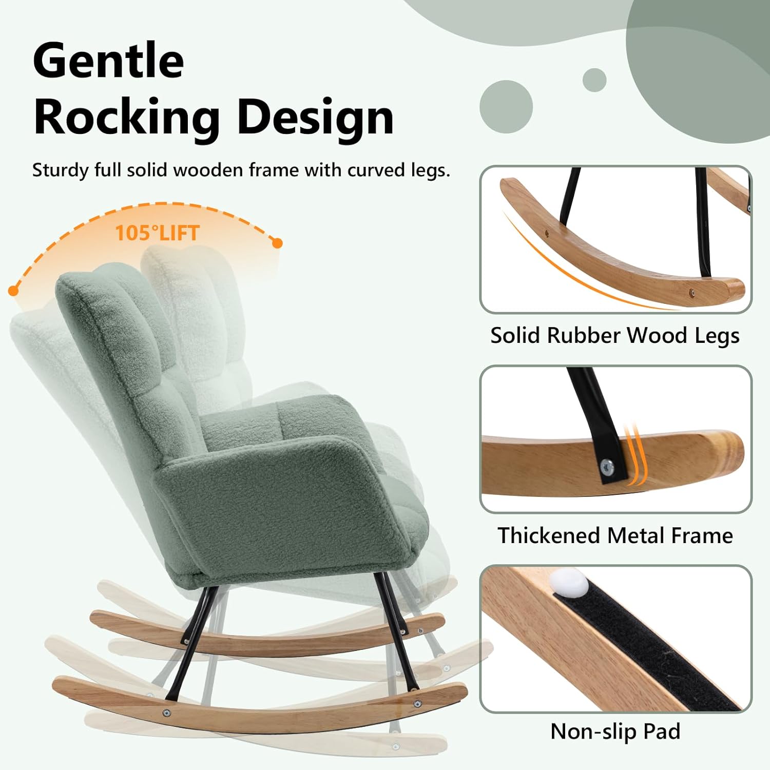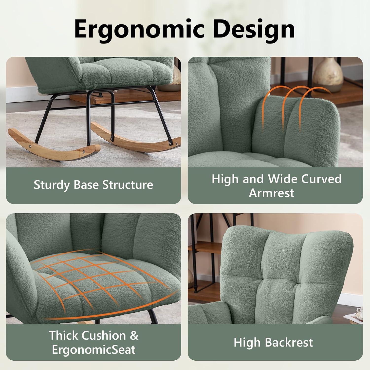 NIOIIKIT Nursery Rocking Chair Teddy Upholstered Glider Rocker Rocking Accent Chair Padded Seat with High Backrest Armchair Comfy Side Chair for Living Room Bedroom Offices (Olive Green)