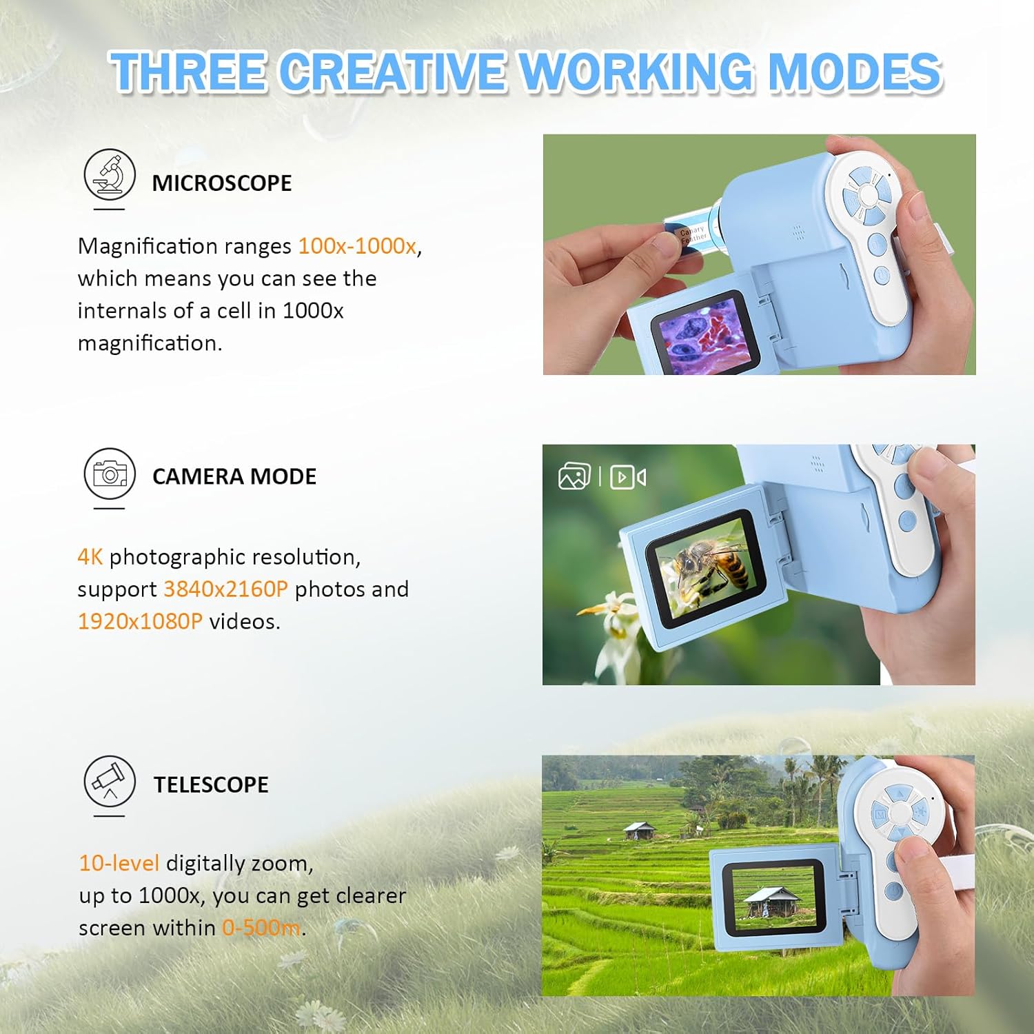 - ๐ฏ-๐๐ป-๐ญ ๐๐ฒ๐๐ถ๐ด๐ป: 1) Microscope Searching, 2) One-Click Photo & Video Recording, 3) Telescope, choose what you want to enhance child's learning experience. And this digital microscope made of 4K resolution, provides much higher clarity