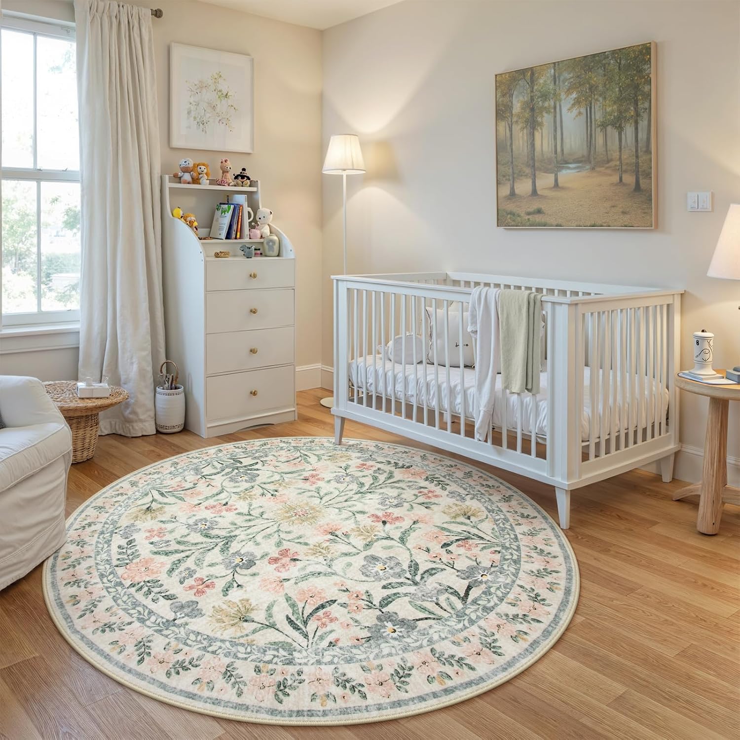 Wonnitar Floral Round Rugs 6ft, Boho Large Machine Washable Circle Rug, Low Pile Soft Flower Botanical Print Beige Round Carpet for Living Room Bedroom Dorm Sunroom