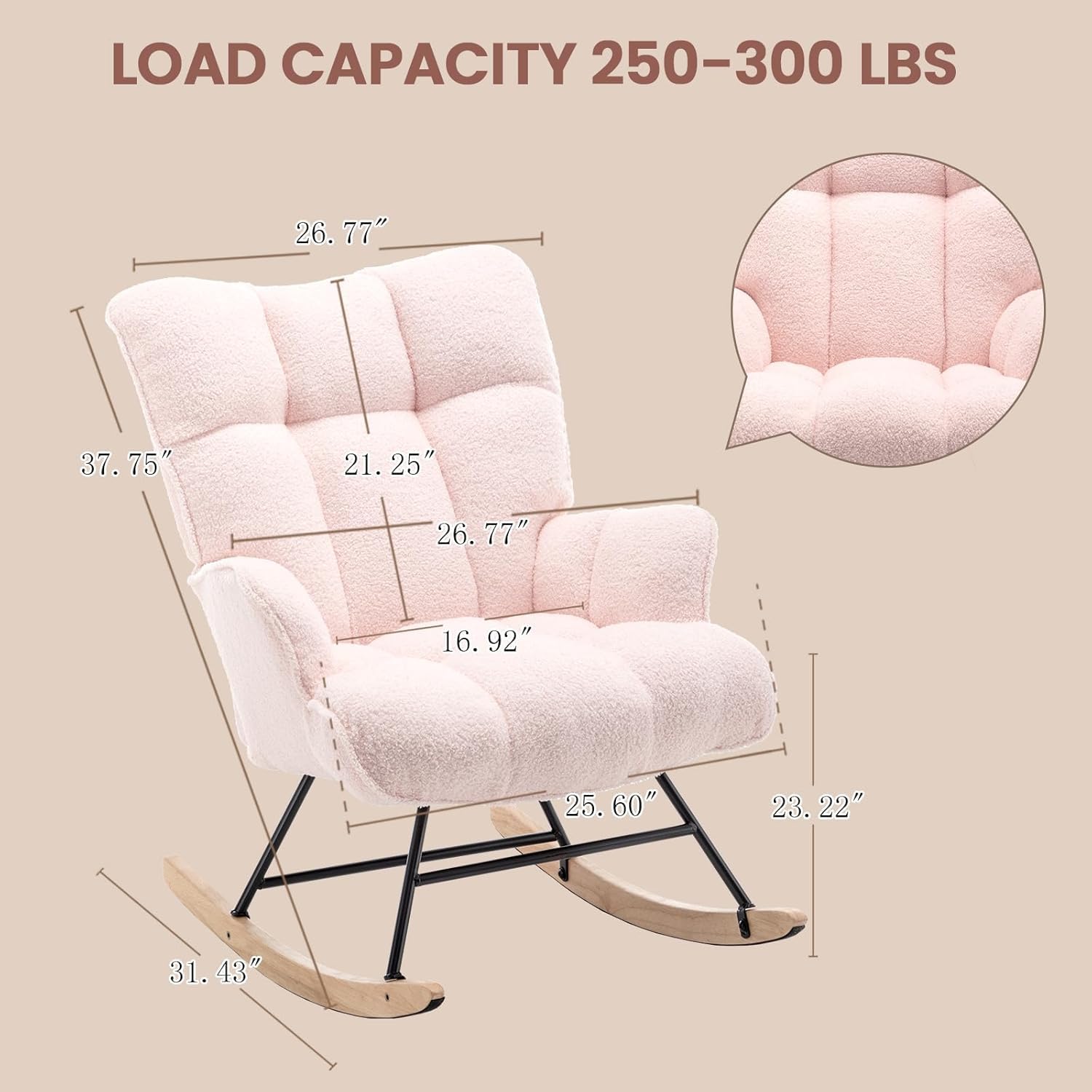 Rocking Chair Nursery Teddy Upholstered Glider Rocker Rocking Accent Chair Padded Seat with High Backrest Armchair Comfy Side Chair for Living Room Bedroom Offices (Pink Teddy)