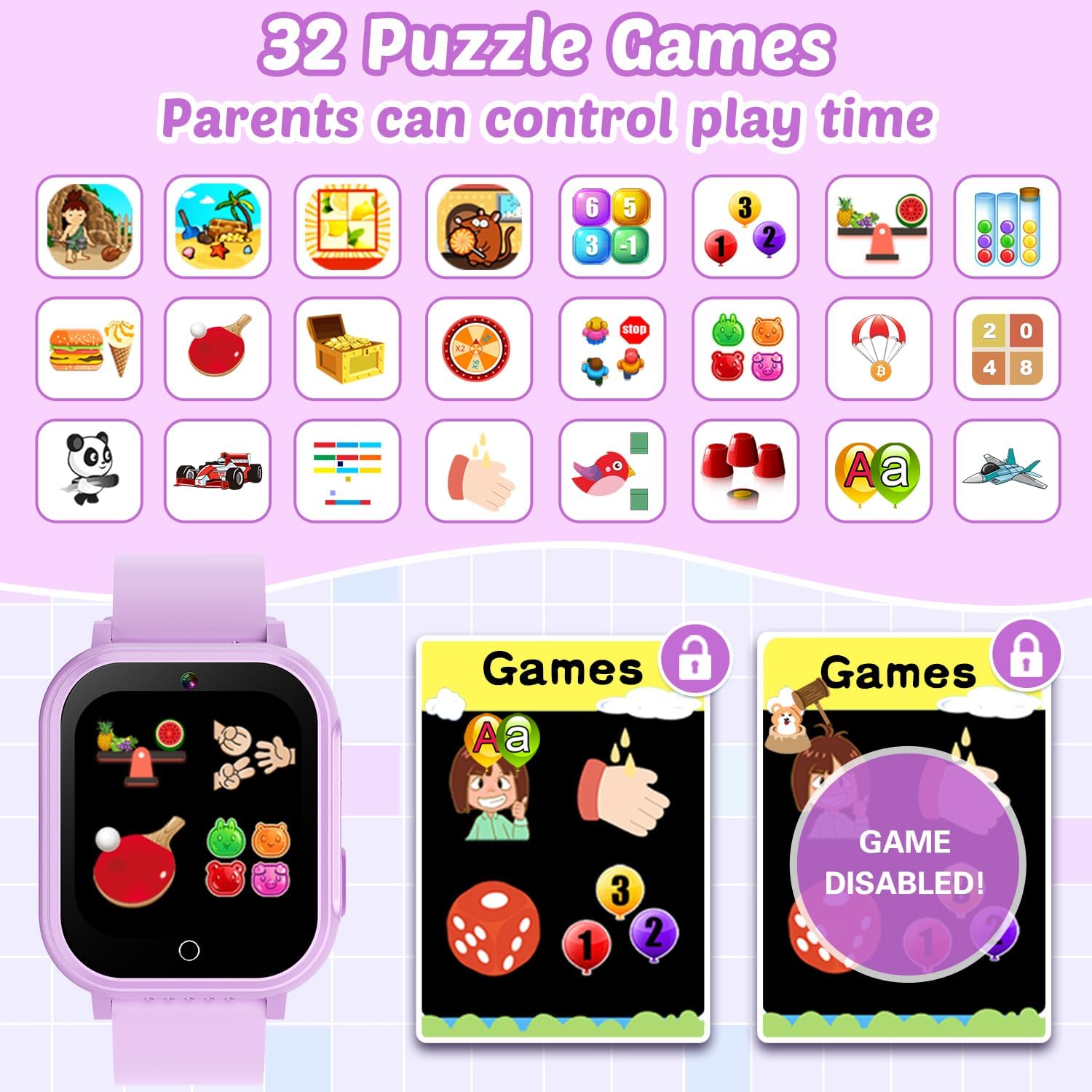 - 👍32 Puzzle Games: Kids smart watch also has 32 different games to choose from kids. These games are more playable and suitable for children of multiple ages, that can help develop your child's brain and logic skills. Kids smart watch support parental control function that traditional watches don't have.