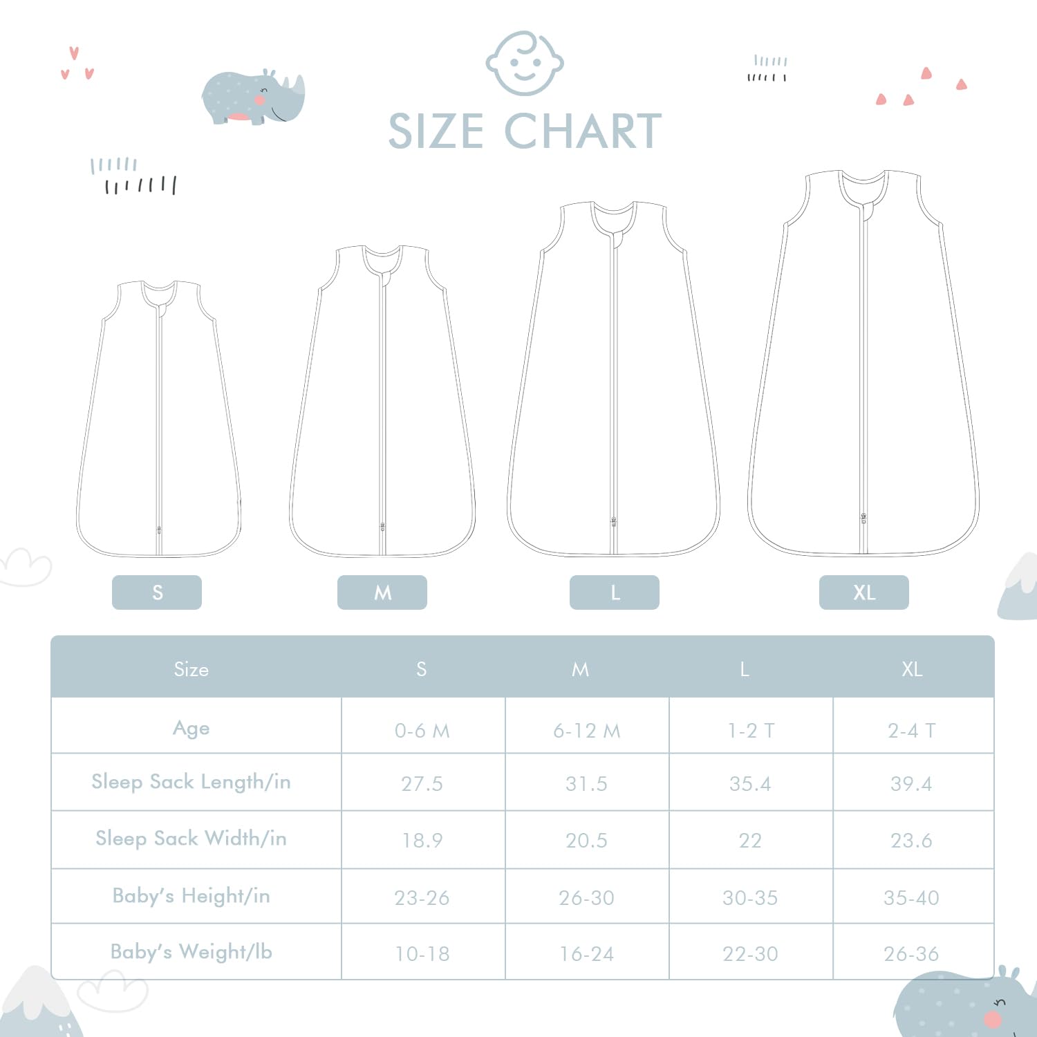 - Our sleeping bags come in four sizes: S (0-6 months), M (6-12 months), L (12-24 months), and XL (2-4 years). The loose bottom design offers ample movement space for your baby. Please note that slight size variations may occur due to handmade cutting. For the best fit, refer to our sizing chart.