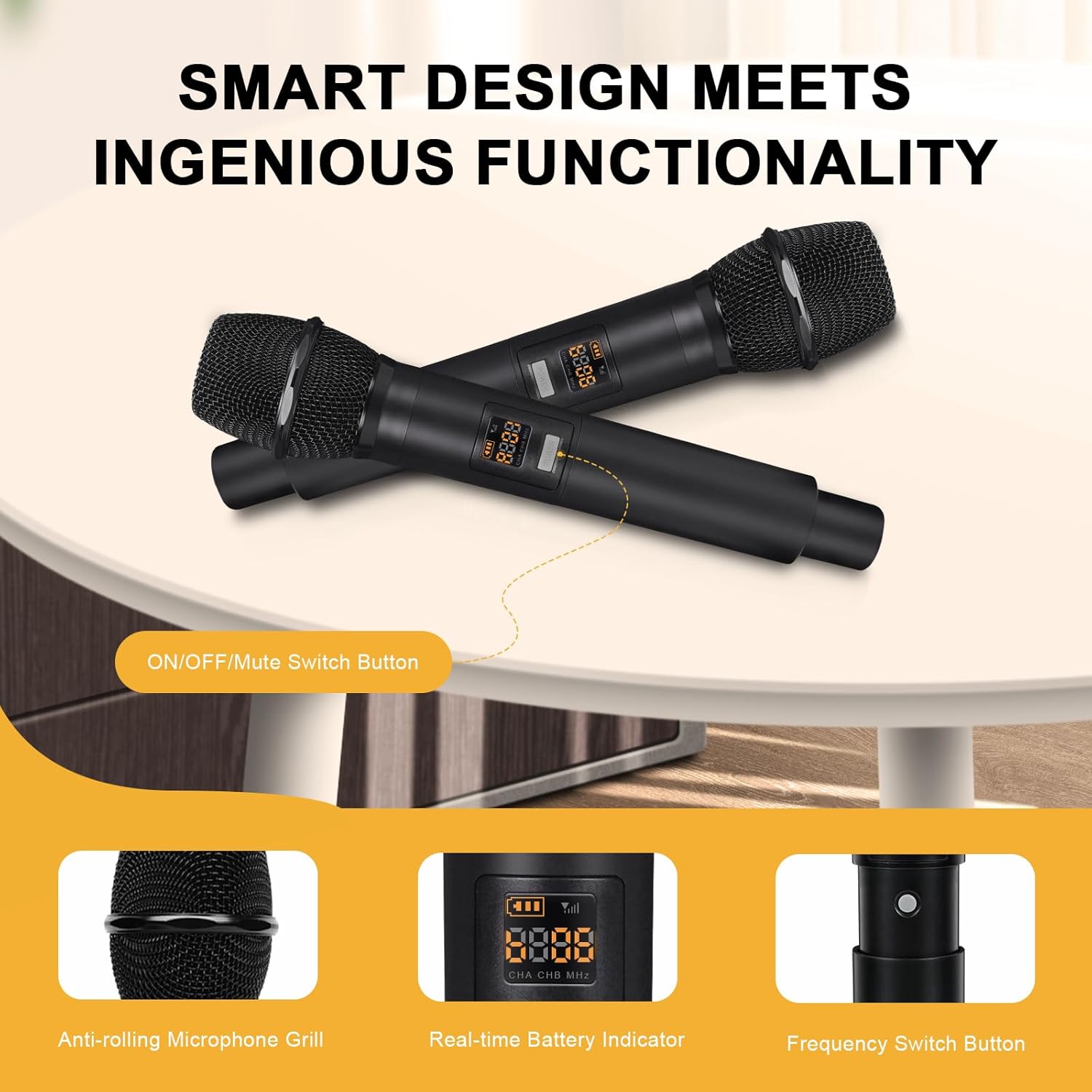 - USER-FRIENDLY DESIGN: The dynamic handheld microphones feature a diamond-edged design that prevents rolling, keeping them securely in place on any surface. The main unitโs clear screen display prominently shows channel assignments, making it easy to identify and switch between channels. This thoughtful design of the microphone system ensures a seamless, stress-free experience, allowing you to focus entirely on your performance