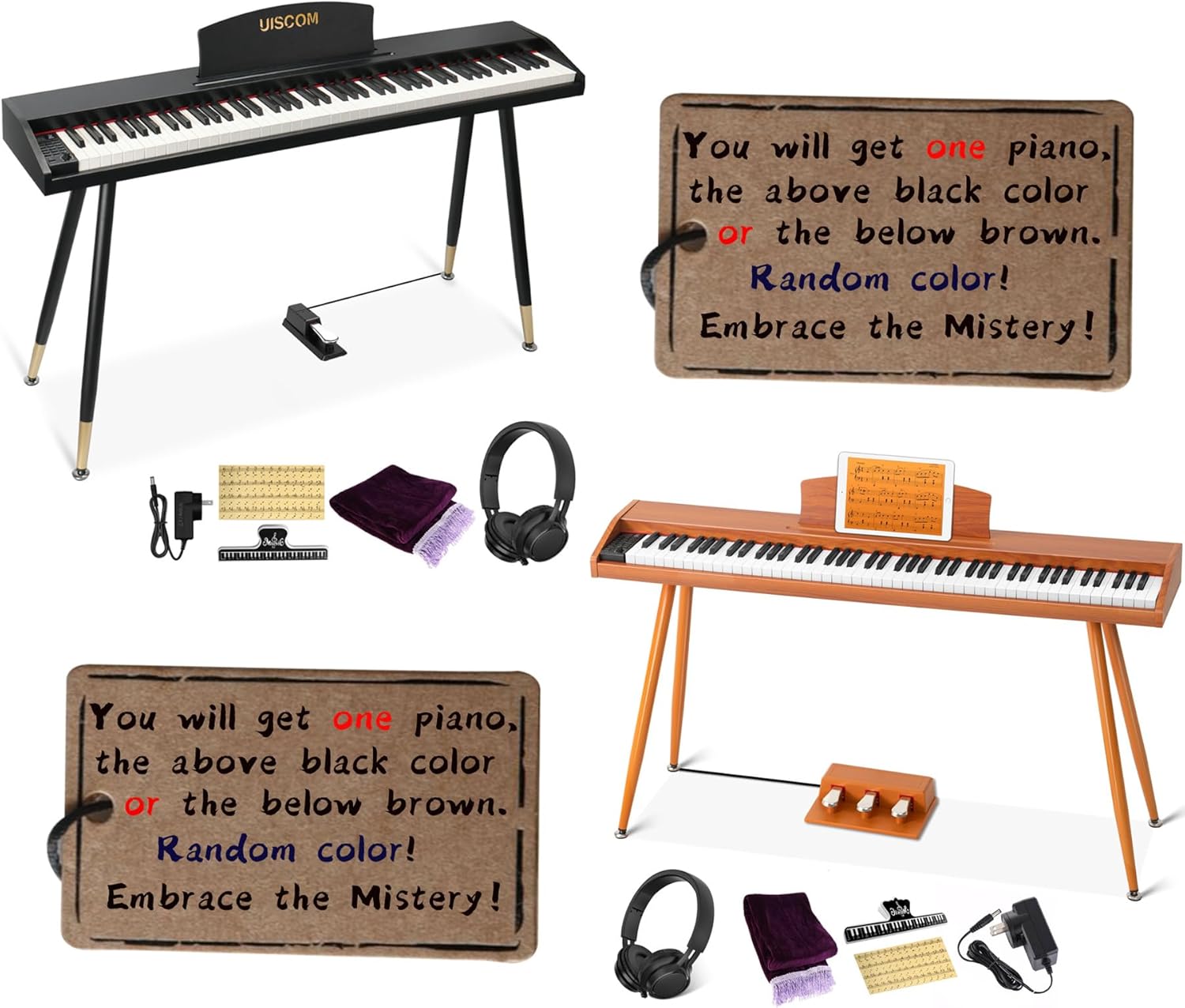 - Notice: You will receive 1 piano, black or brown by random! DIGITAL PIANO SET: Full-size 88 key piano keyboard with triple pedal, music stand, headphones, music clips, piano cover and key stickers. Imitating the touch of an acoustic piano, it is perfect for beginners to explore the wonderful world of music.