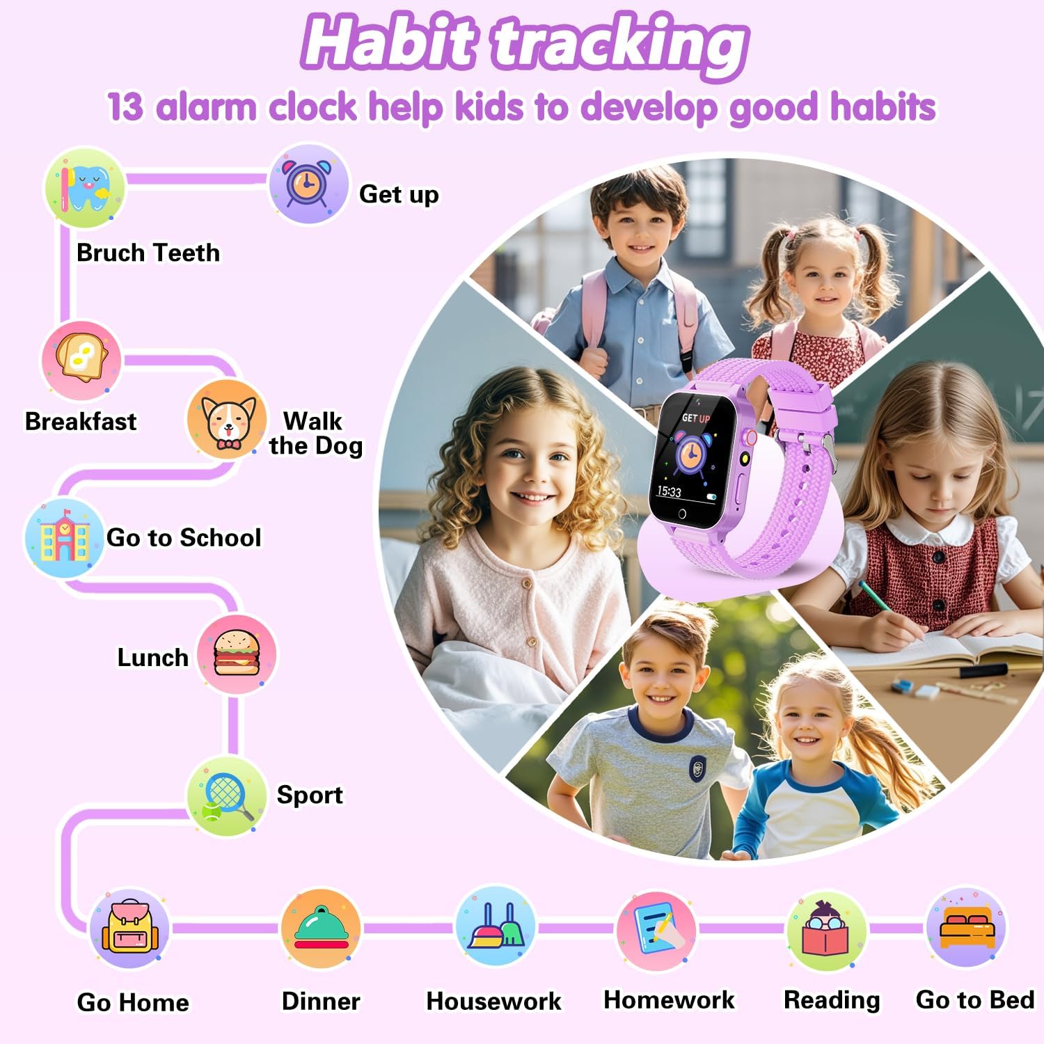 - 【26 Funny Puzzle Games】Upgrade kids smart watches with 26 puzzle and educational games for kids aged 3-12, designed to develop theri reaction time, logical thinking, and hand-eye coordination. Smart watches for kids also supports parental control function that can limit the playing time for the child.