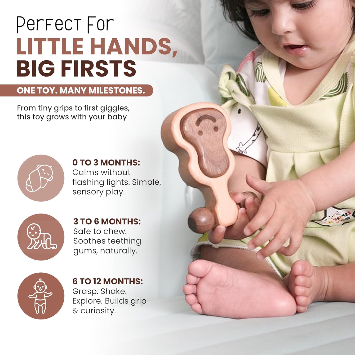 - 🌾 NO ARTIFICIAL, OVERSTIMULATING COLORS Many silicone and rubber teethers are over-colored to grab a parent’s attention — not made for a baby’s brain. This teether helps baby develop senses to appreciate natural tones and simple shapes from the very beginning