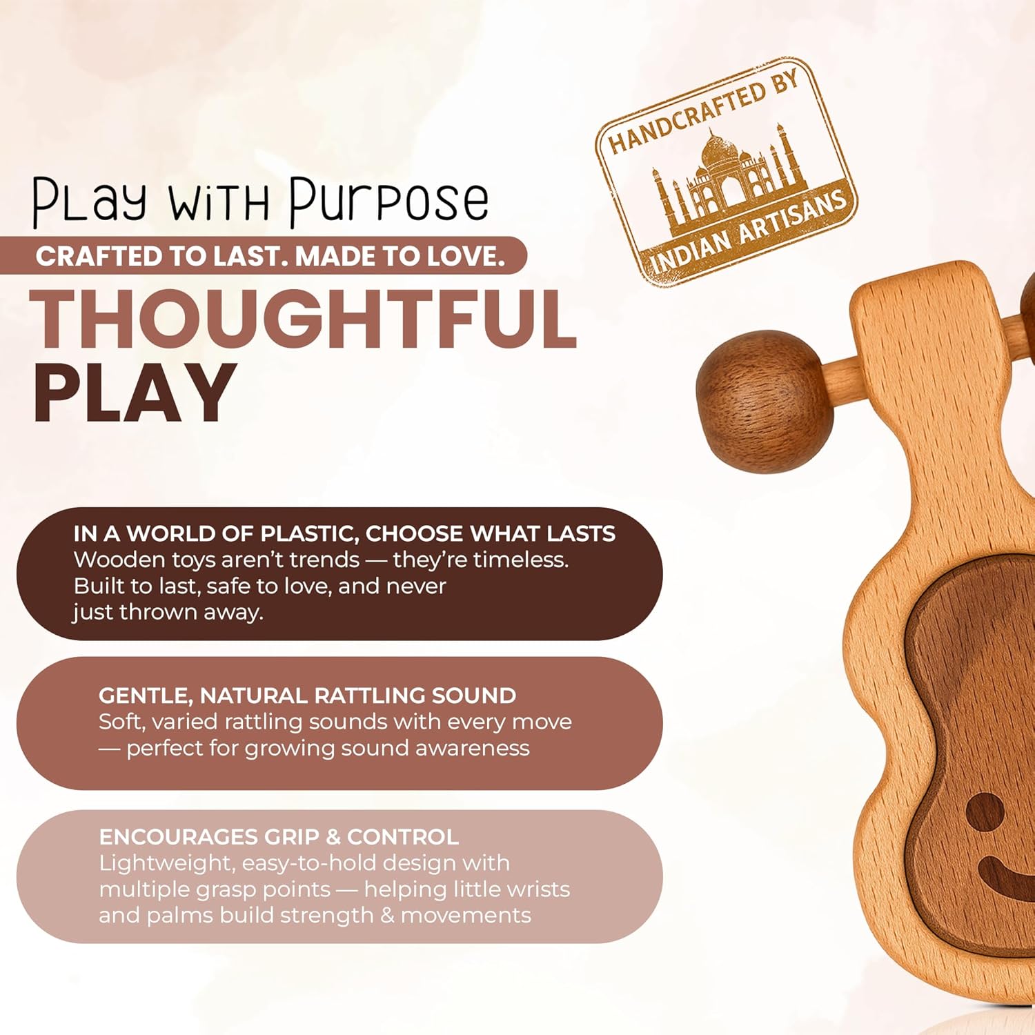- 🌿 HANDMADE & MONTESSORI-INSPIRED Simple, safe, and thoughtfully designed. This handmade wooden toy aligns with Montessori principles, encouraging natural discovery and development — with no batteries, screens, or plastic distractions.