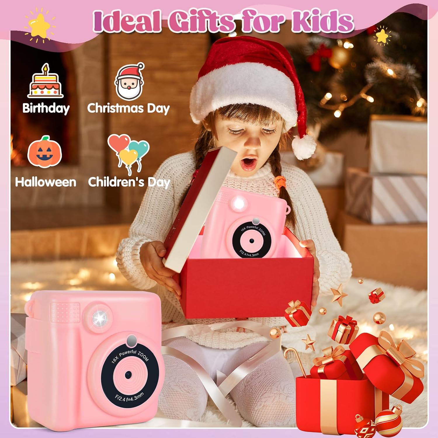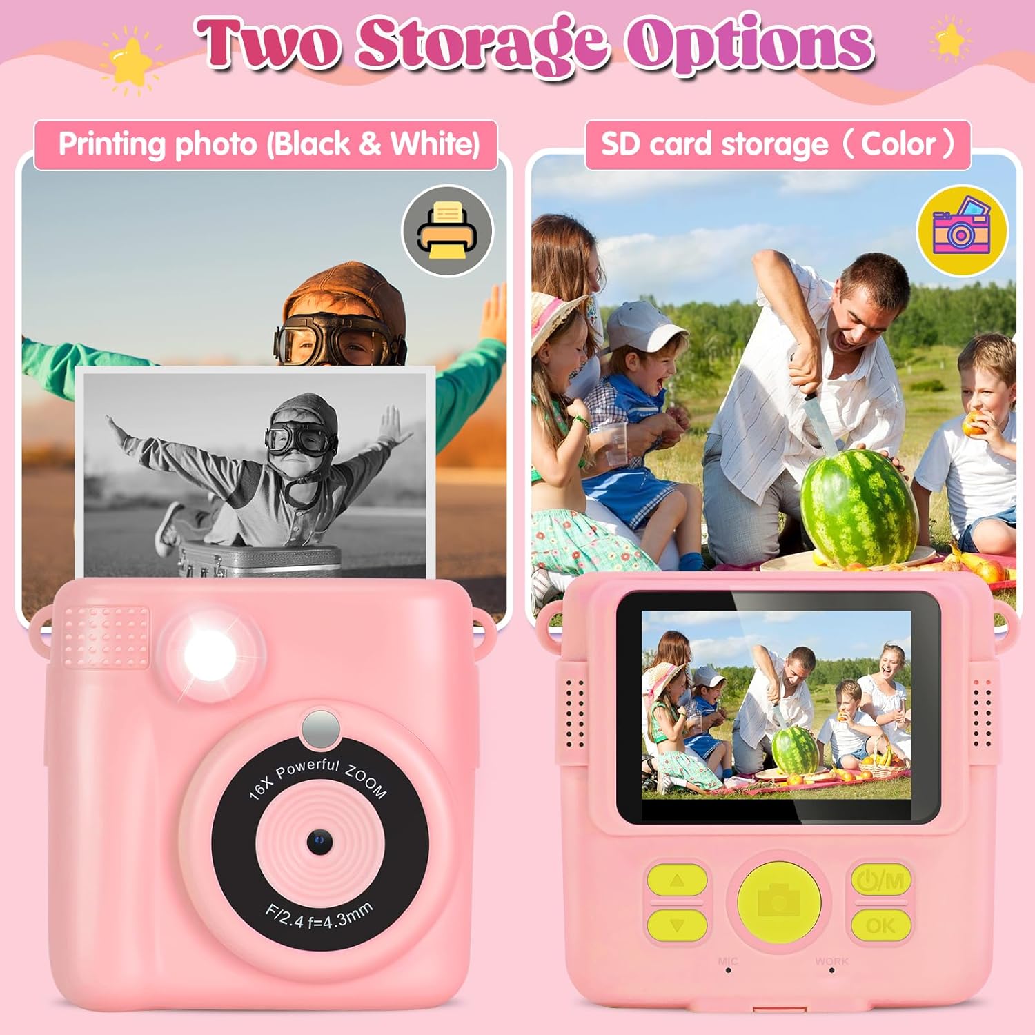 - Multifunctional Kids Camera: This mini instant camera features 2.4 inch large screen,1080P video,16X the digital zoom,flash,time -lapse,continuous shooting,games,filters frame,mp3 and more,meet the different needs of boys and girls.Our camera have 15 kinds of scene filters and 16 kinds of sticker filters which can enhance kids' creativity and stimulate children's desire and interest in photography