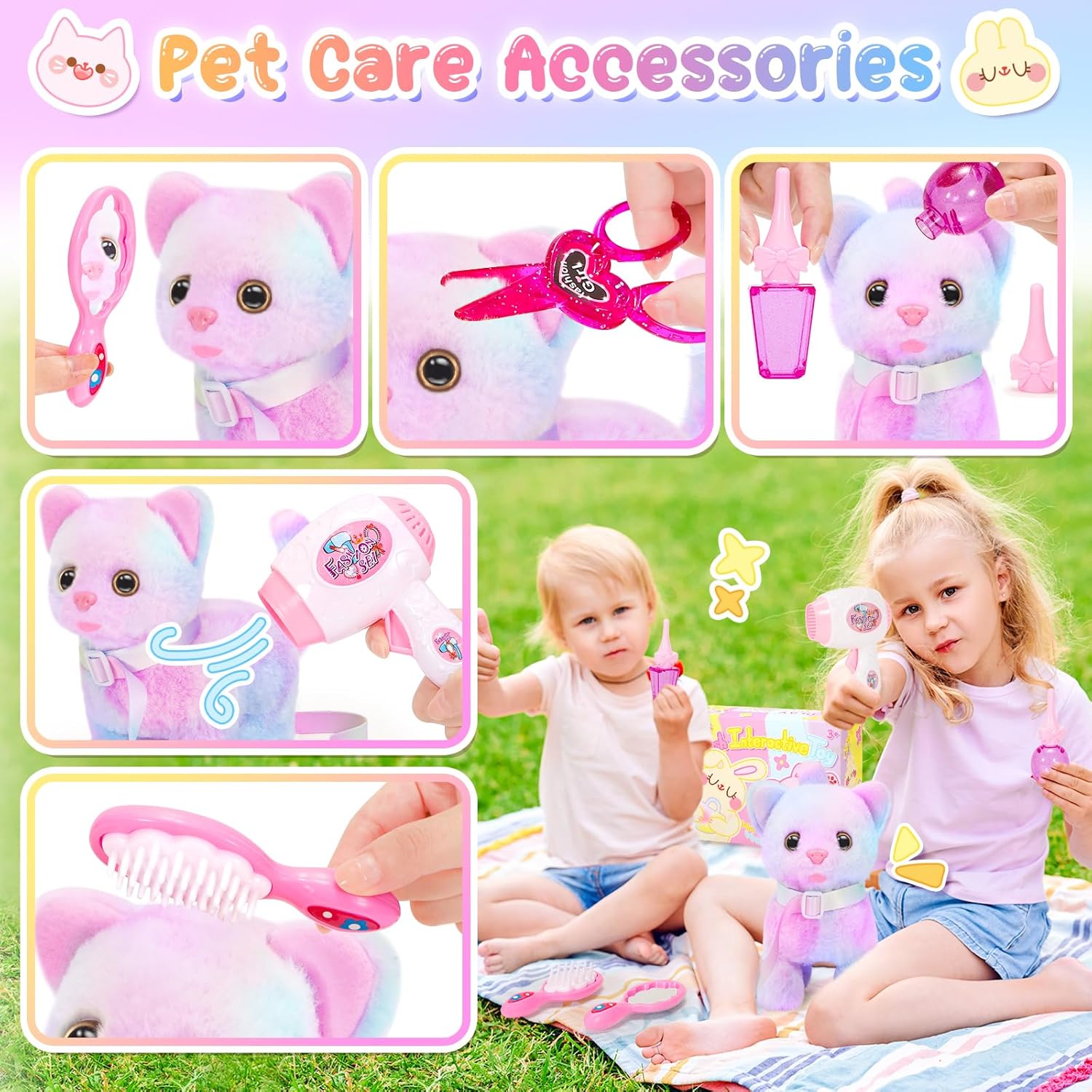 - Cat Toys for Kids: Ready for new companions! The cat plush set includes 1* electric cat with leash, 1* tote bag, 1* hair dryer,1* scissors,1* mirror,1* comb and 2* cleaning supplies. Let your child pretend to take care of their pet friend, take a walk together and enjoy the fun of raising a pet