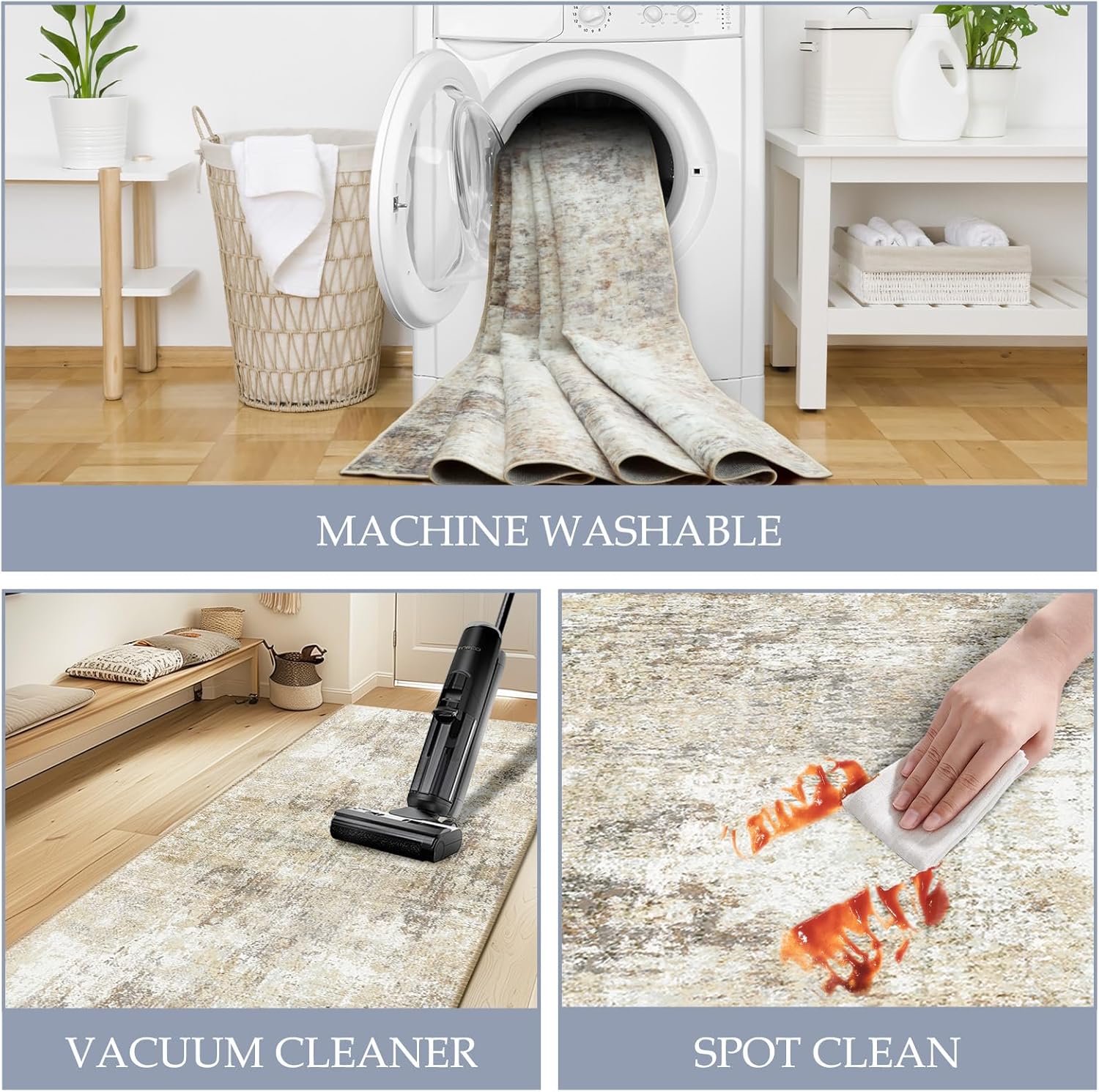 - Tides Series β Effortless style that flows with your life.This modern machine-washable non-slip rug features reinforced edges and a low-pile design that resists dirt. Its water-repellent surface makes spills easy to clean - liquids bead up for quick wiping. Simply machine wash in cold water (no bleach) to refresh. The non-slip backing keeps it securely in place. A perfect blend of function and contemporary design for active homes.