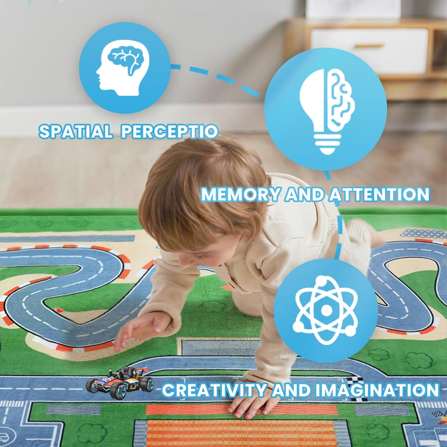 - Fun Educational Race Track Design: This vibrant car rug stimulates imagination and learning. Perfect as a classroom rug or playroom rug, it helps develop spatial awareness and creativity in toddlers and young children