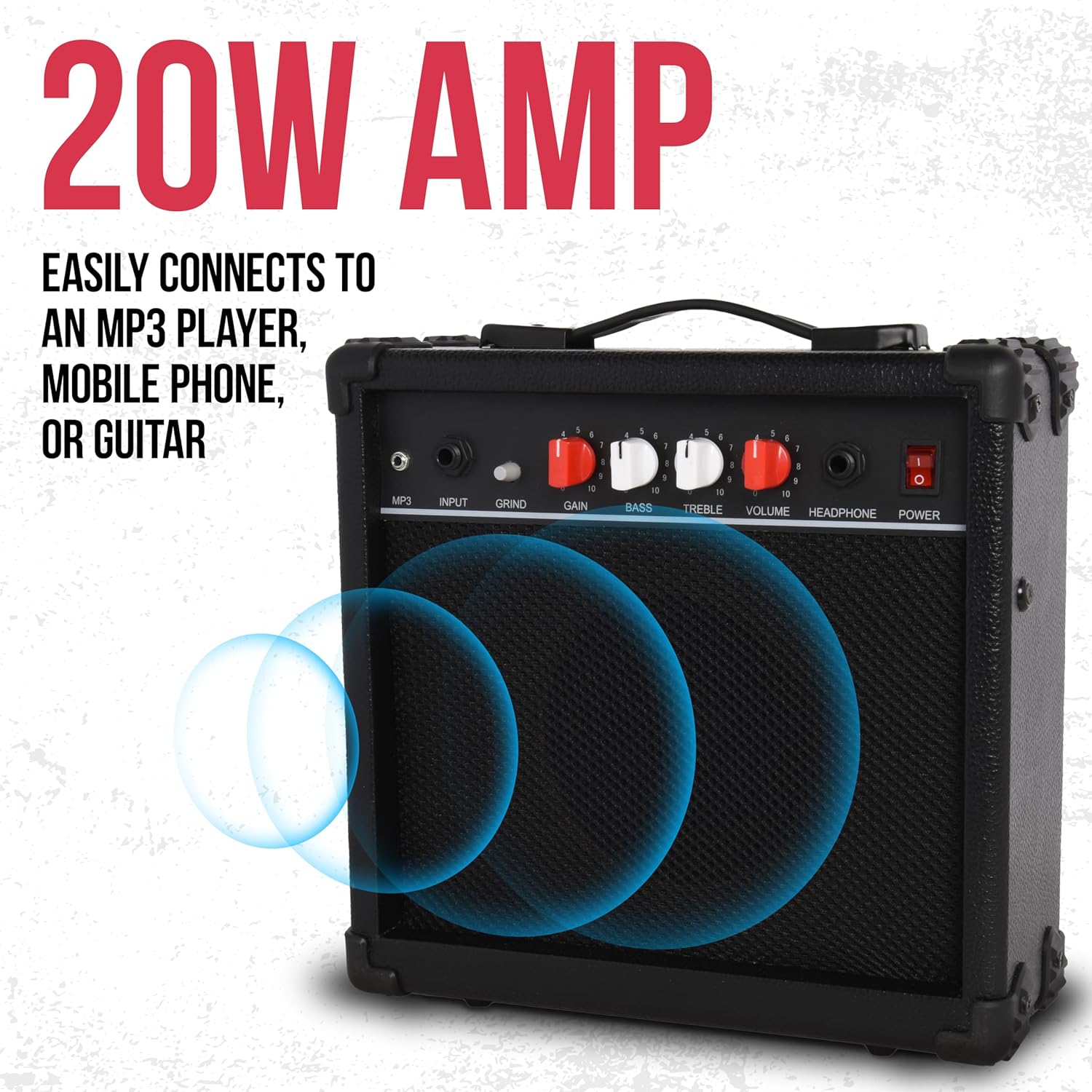 - 20 WATT AMPLIFIER WITH CABLE | Pack Includes 20W Amp with Built In Speaker, Headphone Jack & AUX Input for Playing Along to Music on Phone or MP3 Player | Integrated Controls Include Gain, Bass, Treble, Volume & Grind