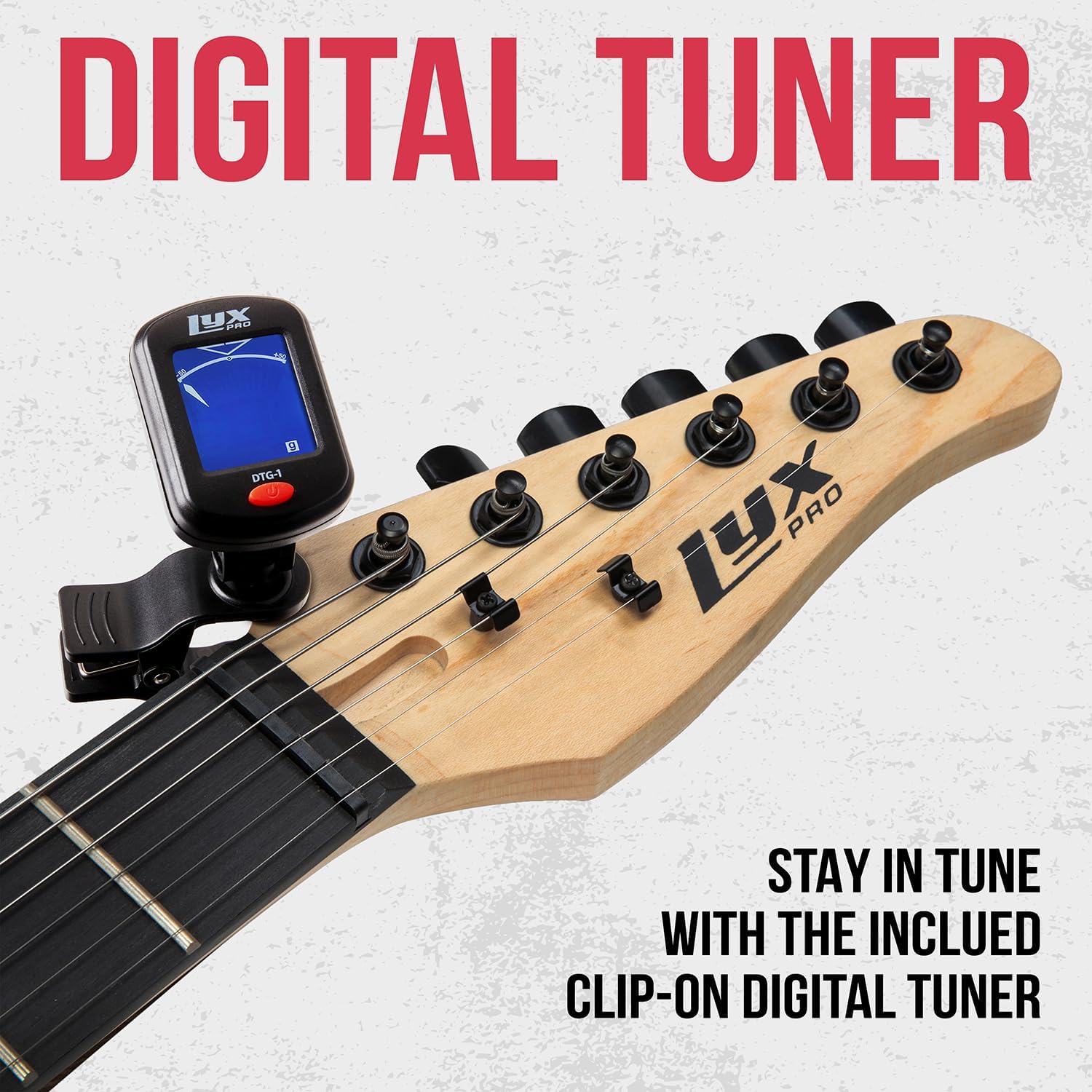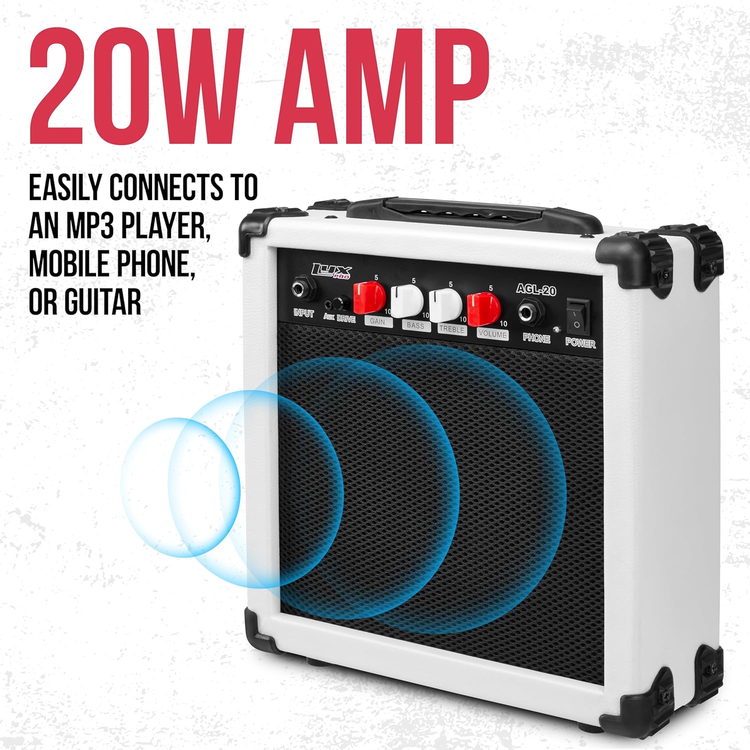 LyxPro 30 Inch Electric Guitar and Starter Kit for Kids with 3/4 Size Beginner’s Guitar, Amp, Six Strings, Two Picks, Shoulder Strap, Digital Clip On Tuner, Guitar Cable and Soft Case Gig Bag - White