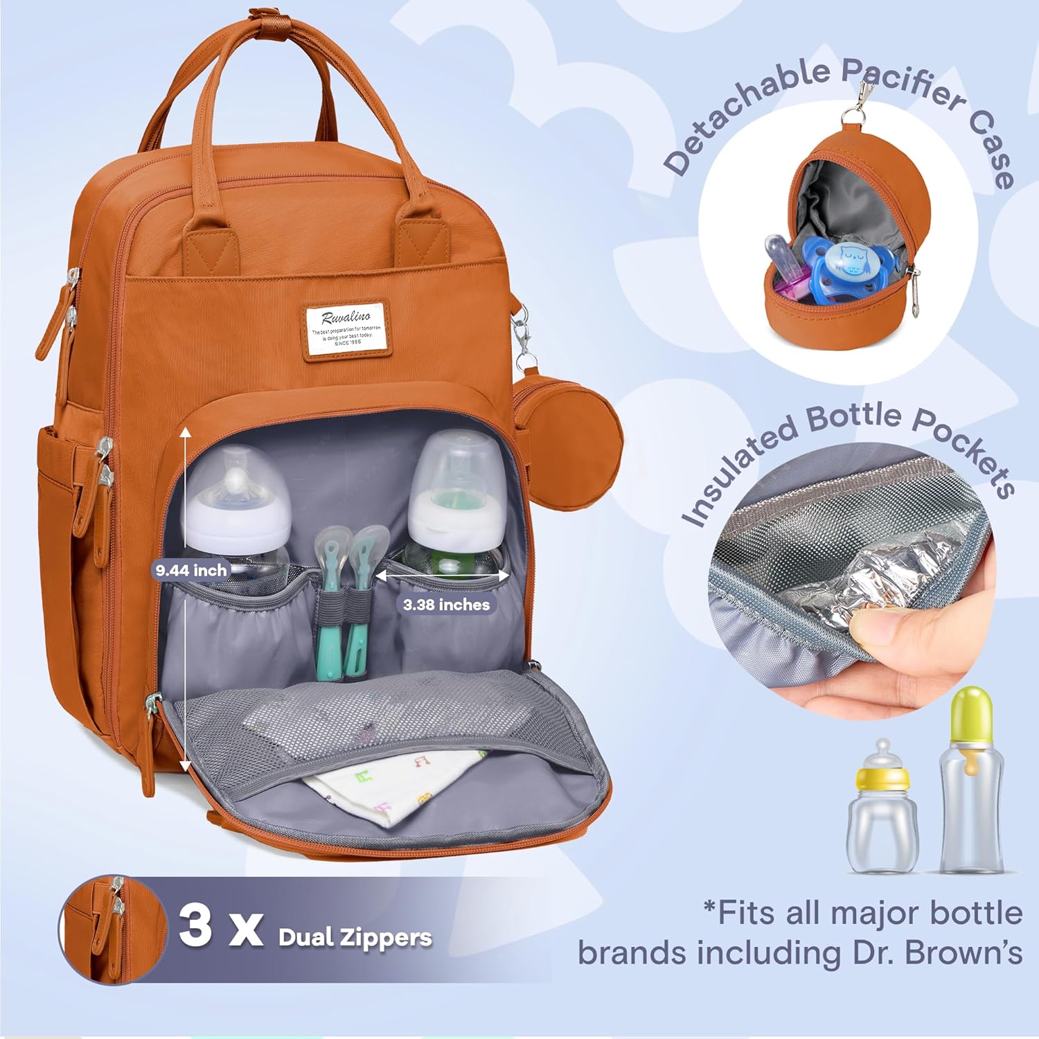 RUVALINO Diaper Bag Backpack-Multifunction Baby Travel Bag with Changing Pad, Insulated Bottle Holders & Pacifier Case, Large Capacity, Waterproof, Maple Orange