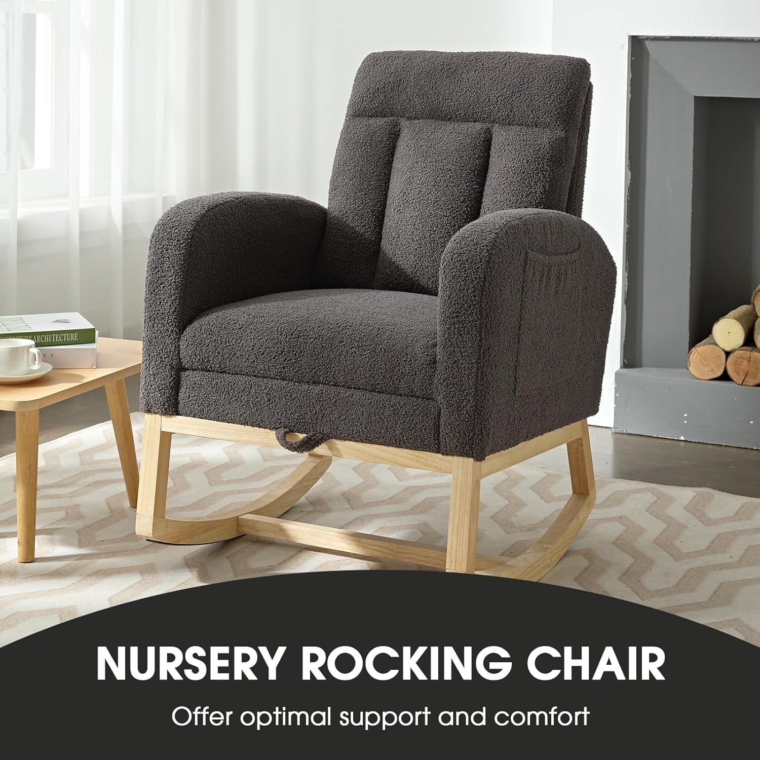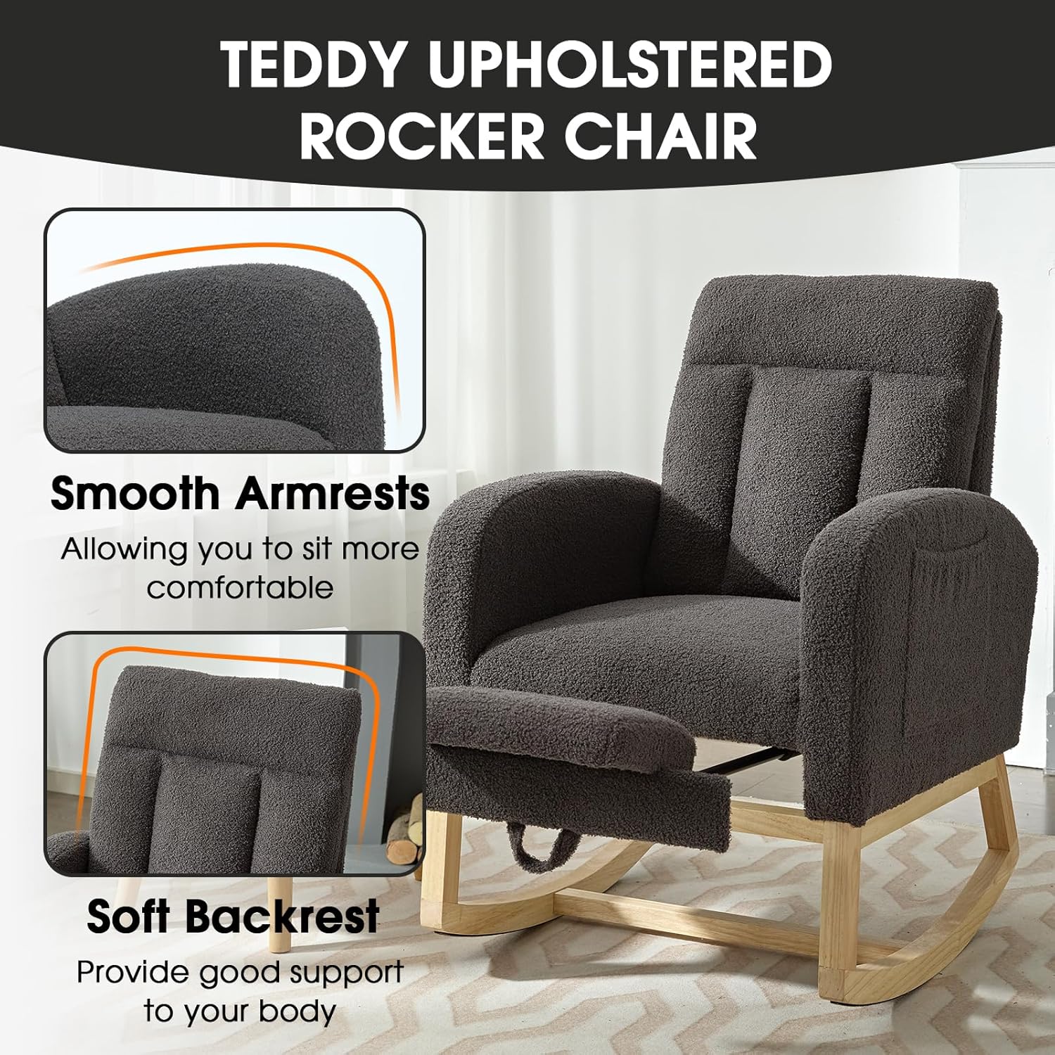 NIOIIKIT Modern Nursery Rocking Chair, Teddy Upholstered Rocking Chair with Footrest, Comfortable Rocker Recliner with Side Pocket, Glider Rocker for Living Room, Bedroom, Nursing Room (Dark Grey)
