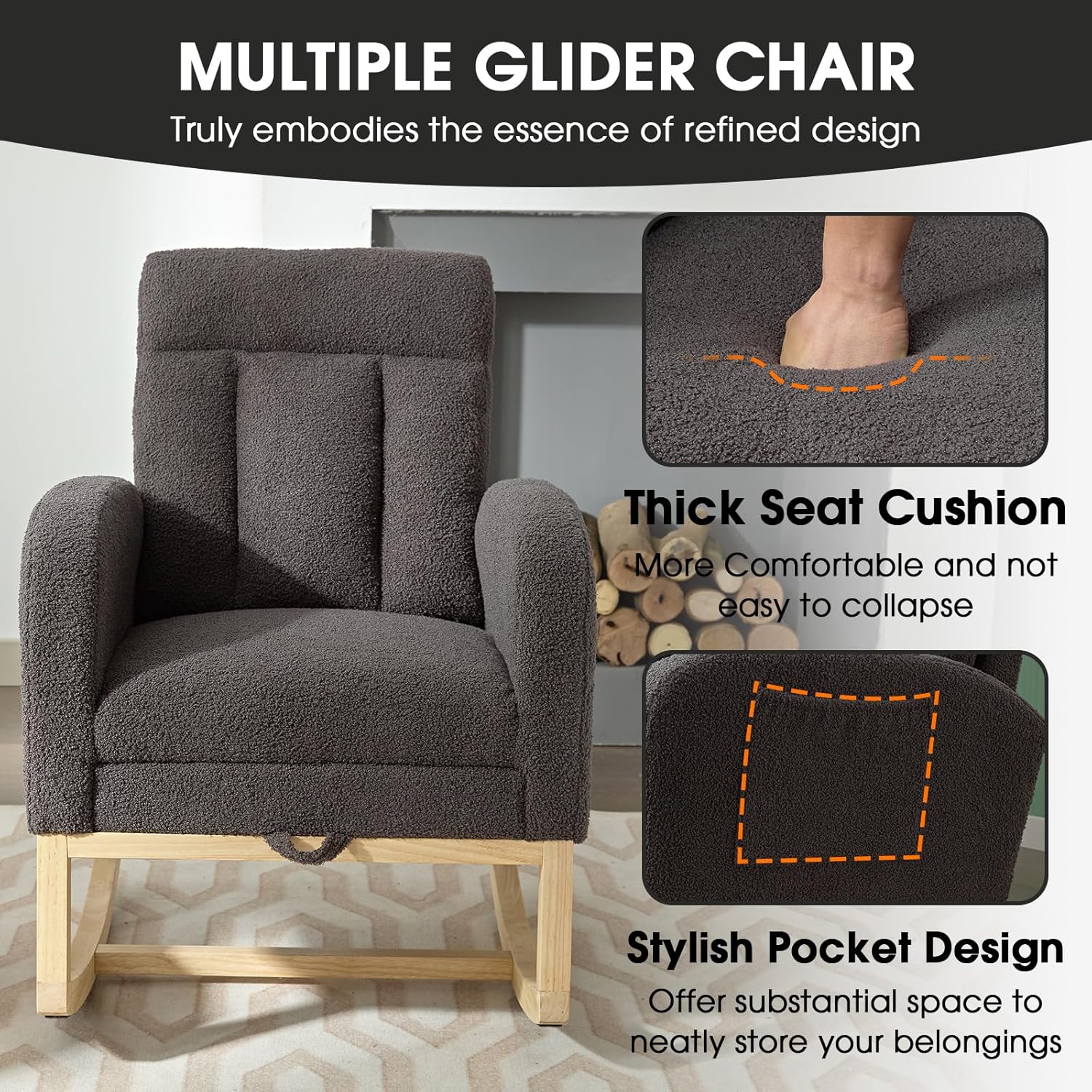 - Better Comfort - Both the backrest and seat cushion of our glider rocker rocking are filled with high-density sponge, which is more resilient and will not deform easily. Covered with superior teddy fabric, the surface is very cosy and easy to maintain. The simple color and smooth lines make this kids rocking chair very stylish and chic. Let you have a better break.