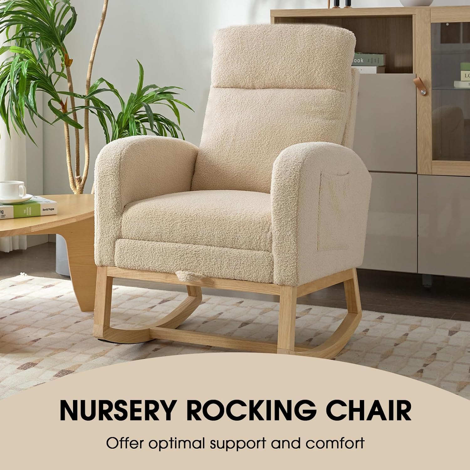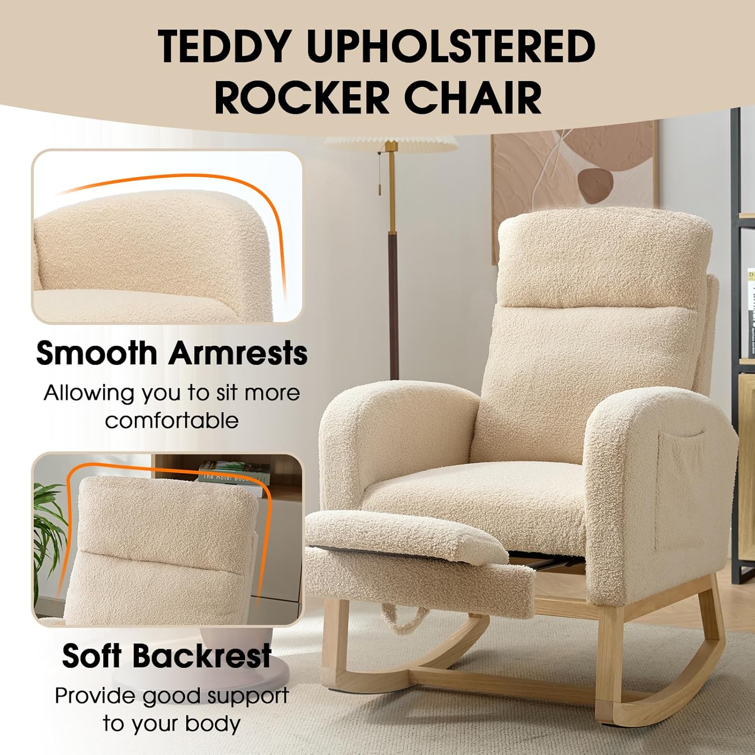 NIOIIKIT Modern Nursery Rocking Chair, Teddy Upholstered Rocking Chair with Footrest, Comfortable Rocker Recliner with Side Pocket, Glider Rocker for Living Room, Bedroom, Nursing Room (Cream)