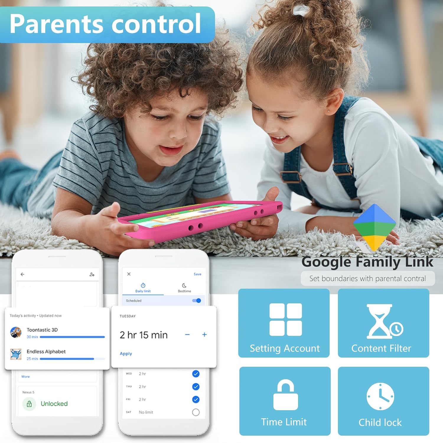 - 【ROBUST PARENTAL CONTROLS】 Google Family Link Parent Dashboard allows parents to manage everything on the phone, including content-filtering and selectting, screen-time limits, pausing or resuming the device, accessing educational content, and approval requests from the app store, like downloading Netflix, Disney+, and Zoom.Make parents peace of mind when handing kids the tablet.