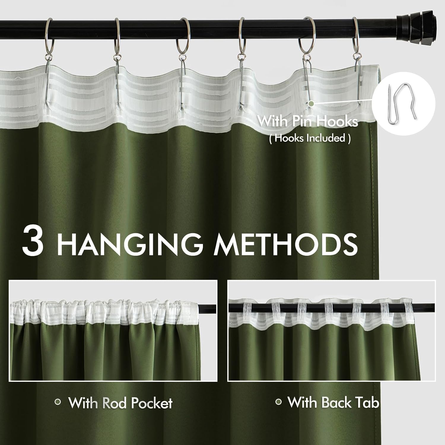 - MULTIPLE HANGING OPTIONS: Each curtain panel features a 3-in-1 top style design: Rod Pocket, Back Tab and Pinch Pleat. The Back loop (2.3 "long) and rod pocket (3.1" long) fit most standard rods. Curtains also can be hung with clip rings or different type of hooks. We will give away 20 pin hooks for each pair of curtains for your convenience (rings won't be included). 3 ways to meet your various needs.