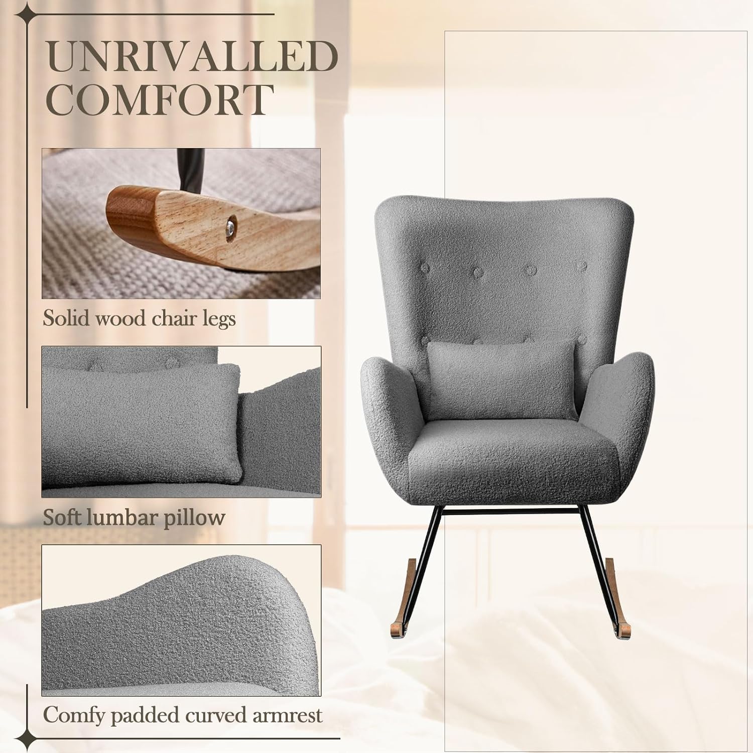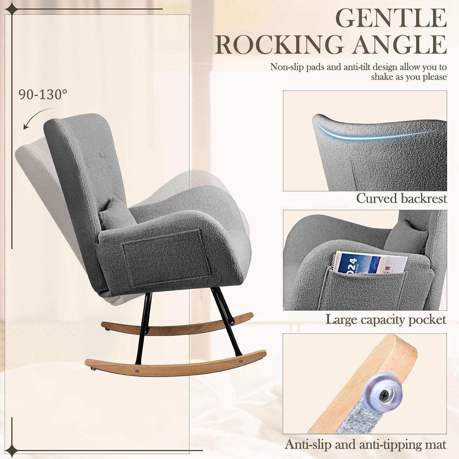 Waleaf Teddy Upholstered Rocking Chair Indoor with High Backrest Glider, Padded Seat Nursing Chair Comfy for Bedroom (Gray)