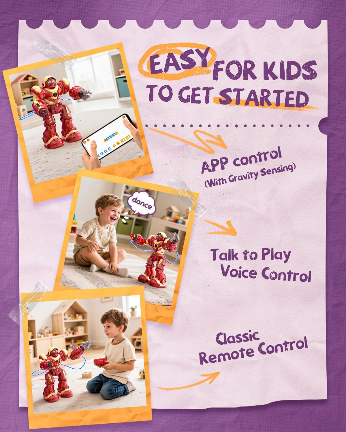 - 【Multiple Control Modes, Maximum Fun】Control the Holyton 5088 robot using a 2.4GHz remote, the Corex App via Bluetooth, or even by tilting your phone with gravity-sensor mode. Plus, voice commands like “Go go go!” bring the robot to move — making every interaction thrilling, smart, and fun