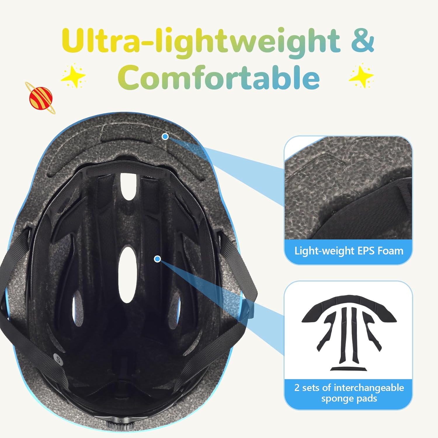 - Ultra-lightweight and Comfortable: The helmet is made of lightweight material; Package includes 1 extra set of inner pads for washing and using interchangeably; 13 vents keep kids cool even in hot weather