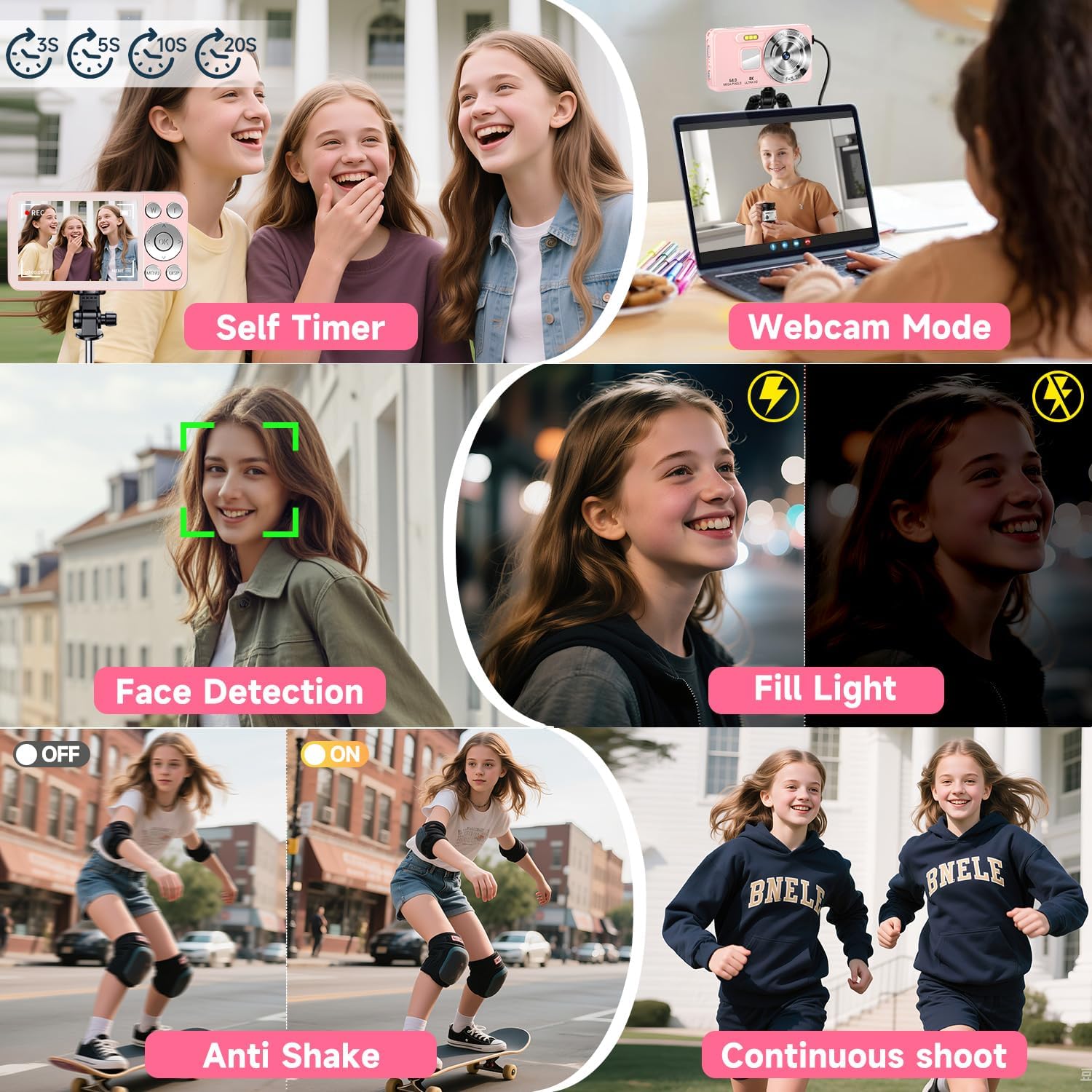 - 📷【UHD 4K & 64 MP Camera】: With a high-performance CMOS sensor, the digital camera for kids can take up to clear 64MP photos and 4K UHD videos, recording every moment in high-quality. Built-in flash ensures clear photos even in low-light conditions.