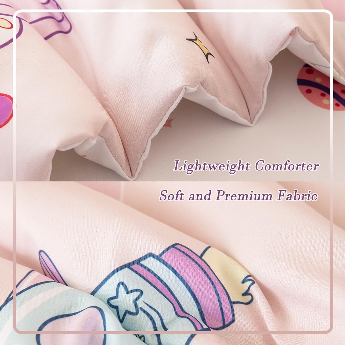 - EASY CARE-This colorful pink toddler bed set is machine washable in cold water with gentle cycle, tumble dry at low temperature. Do not bleach. Do not soak. As the comforter is packaged in vacuum bags, it might be some wrinkles when you receive it. You can put it in the dryer on low heat to help take the wrinkles and will come out fluffy.