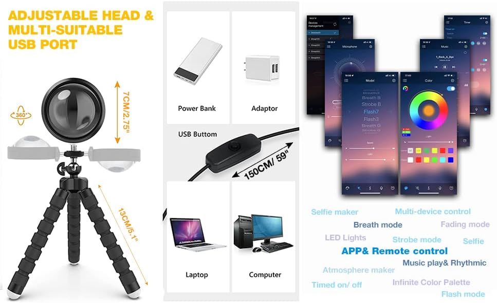 - 【Portable size】The lamp tripod can be rotated and adjusted.The Sunset Lamp head can be rotated 360 degrees, By changing the rotation angle and distance of the illuminator, different circular lights can be emitted from different angles, thereby bringing different effects. The farther the distance is, the larger the projection projected on the wall or ceiling.