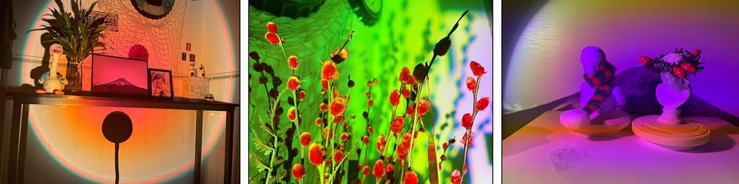 - 【Night Light-16 Colors Sunset Light & 4 Flashing Modes】The sunset lamp projector build-in RGB led, 16 kinds of light effect and 4 dynamic modes(Flash/Strobe/Fade/Smooth Effect) to choose from, provides a comfortable and romantic atmosphere. There are so many choice, you would find one you like.Suitable for children's rooms, bedrooms, creating a different sunset projector light atmosphere, let you enjoy your leisure time and your family.