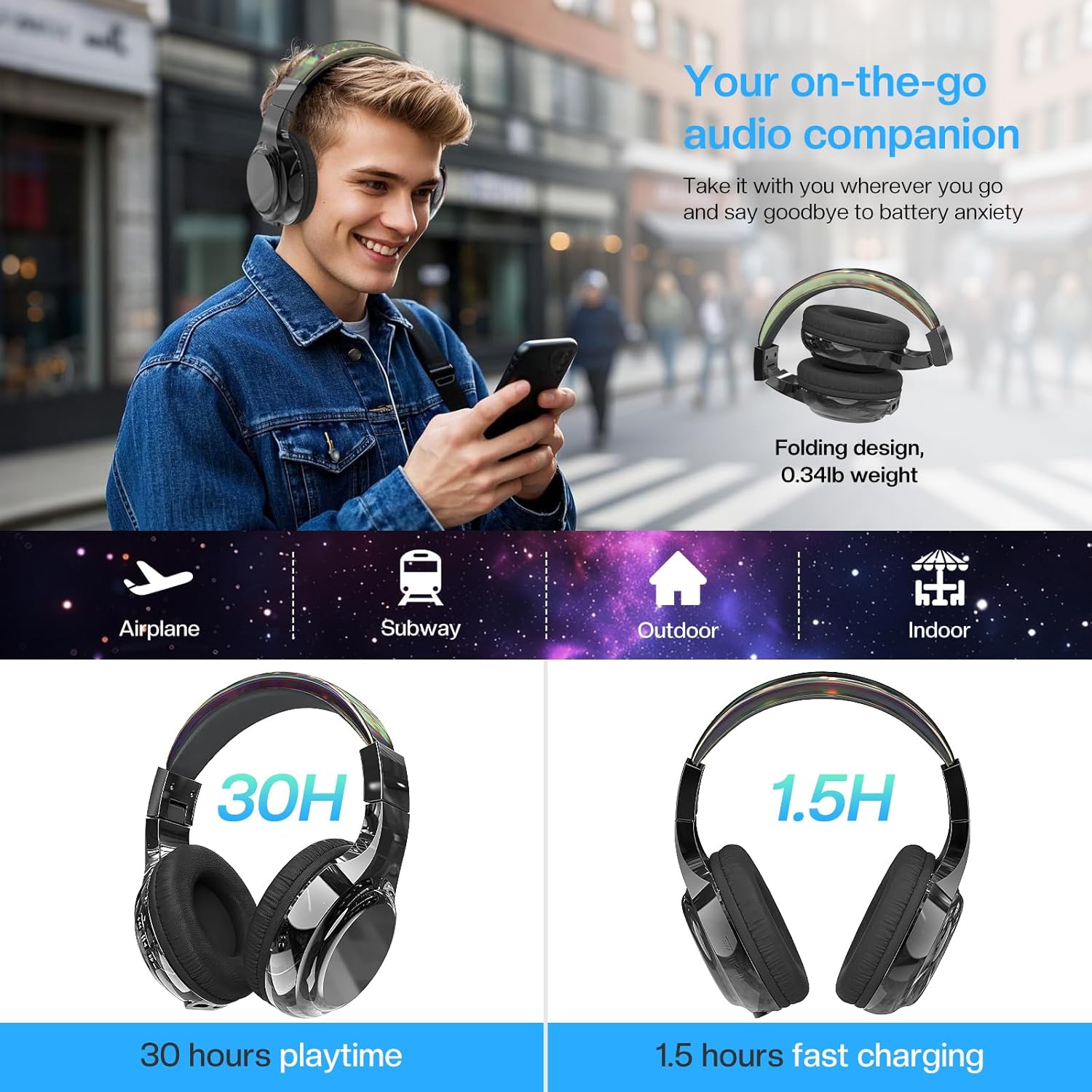 - 30-Hour Battery Life & Portable Foldable Design:With up to 30 hours of playtime and USB-C fast charging, these headphones eliminate battery anxiety, making them perfect for long flights, train journeys, or daily commutes on the subway. The foldable design and lightweight construction (only 0.34lb) make them easy to carry and store, whether your child is heading to school, the library, or the park.
