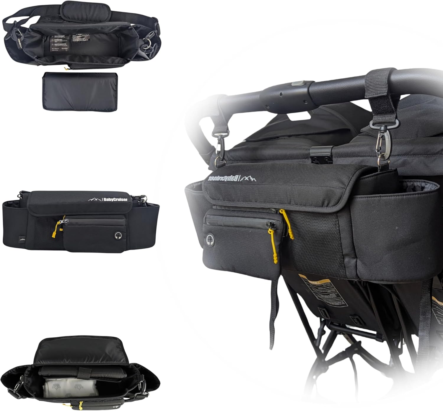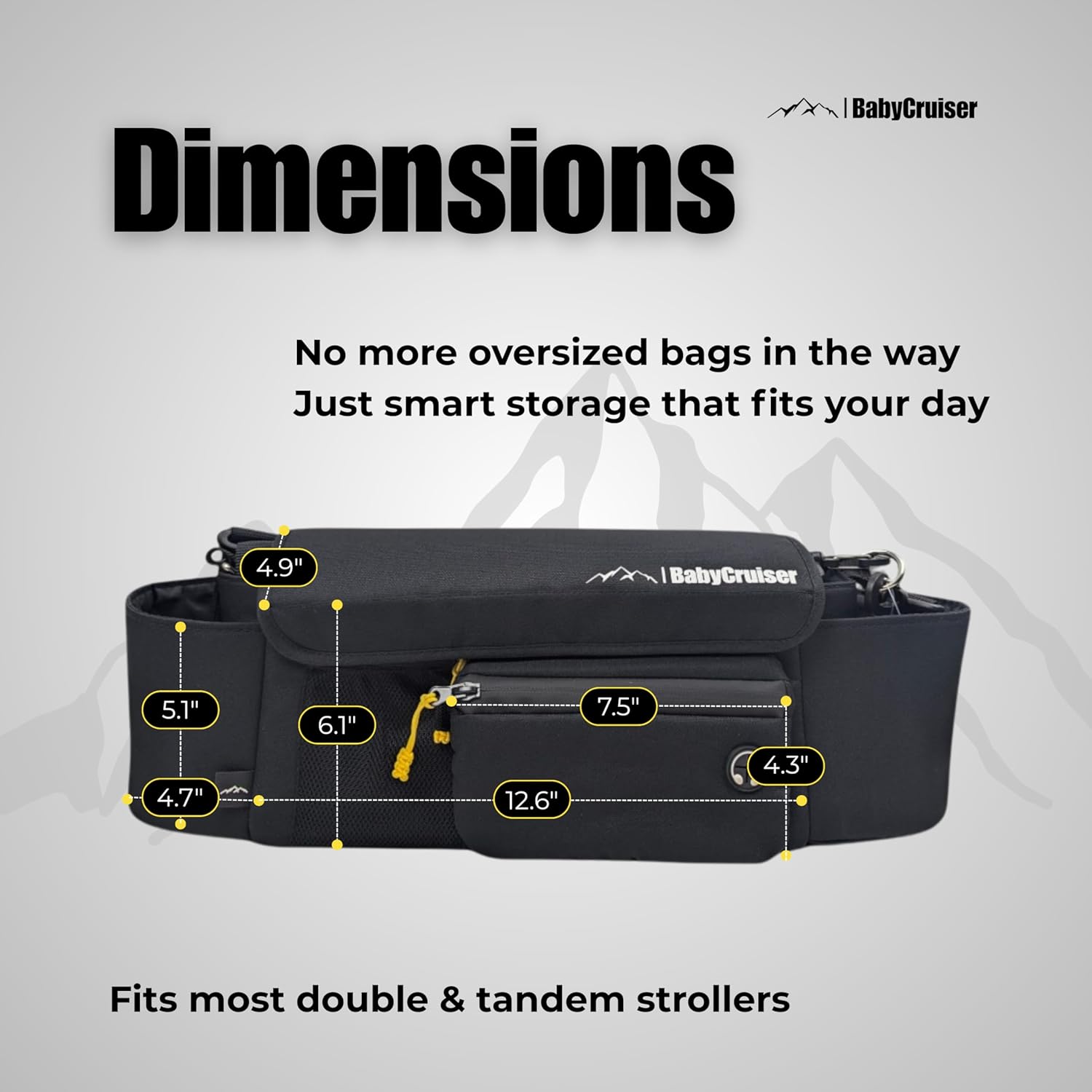 - Stroller Caddy with Spacious Main Compartment: Plenty of room for all your baby essentials, including diapers, wipes, toys, snacks, and more. This diaper bag organizer ensures everything stays neatly arranged. Dimensions: 12.6" width, 4.9" depth, 6.1" height.