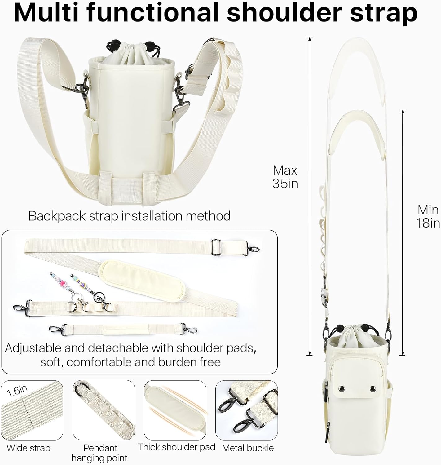 - Multiple Ways of Carrying: water bottle pouch is equipped with a removable and adjustable wide shoulder strap and handbag strap, shoulder strap (size can be adjusted from 36in to 69in, 1.6in wide with an enlarged shoulder pad, plus multiple hanging points, Metal fasteners), 1 shoulder strap can be changed from cross body to double-shoulder, which can be used as cross body bags, backpacks, shoulder bags and handbags, suitable for all body shapes to meet your needs. Long time traveling to carry.