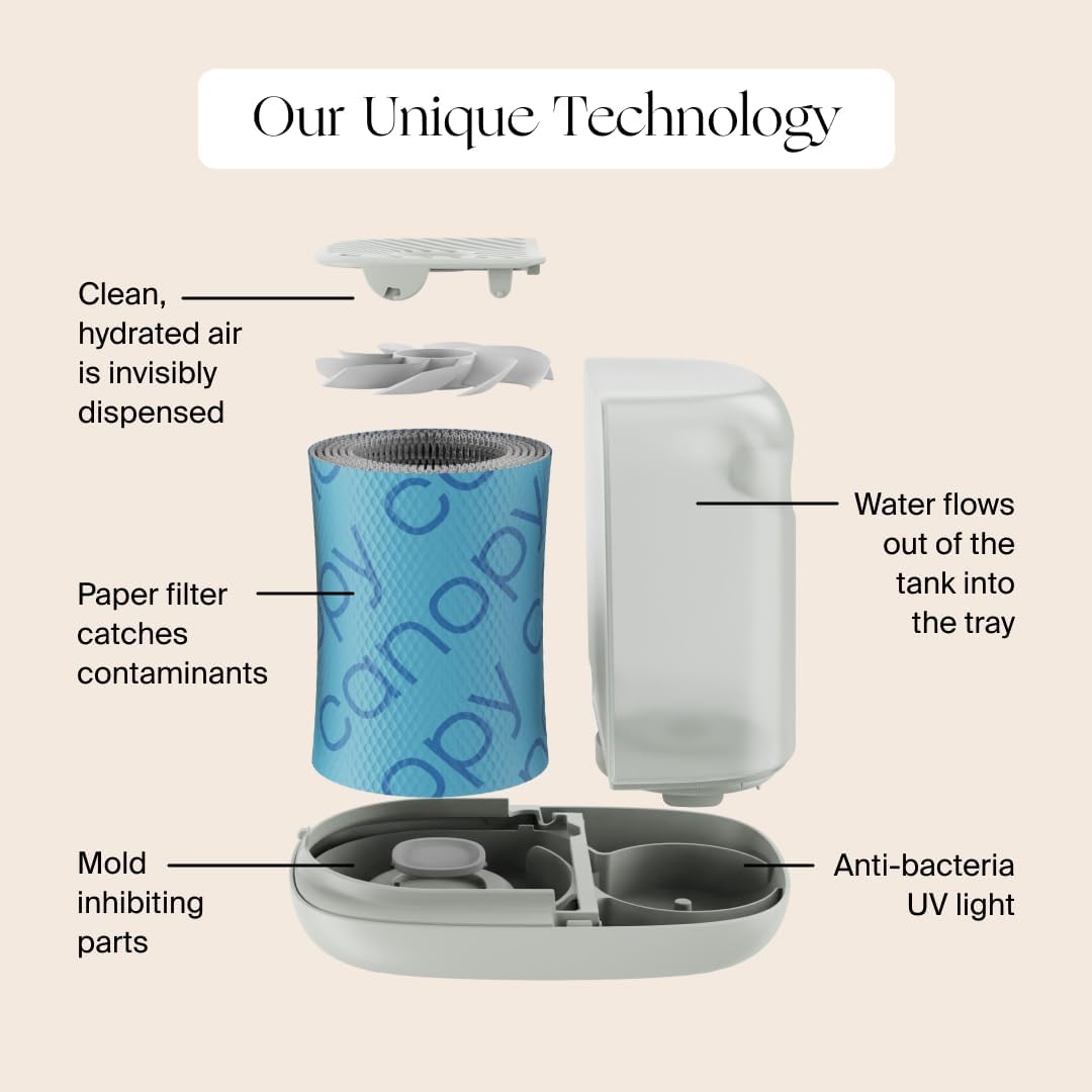 - THE CANOPY BRAND PROMISE - 60 DAY GUARANTEE - We are driven by the quality of our products and our commitment to creating reimagined household devices that effortlessly optimize the home for beauty and wellness. Every Humidifier comes with our state of the art technology and design - an experience only found with Canopy. Not only will our humidifier help you improve your health, skin, and sleep quality; it will help you unwind, relax and destress after a long day.